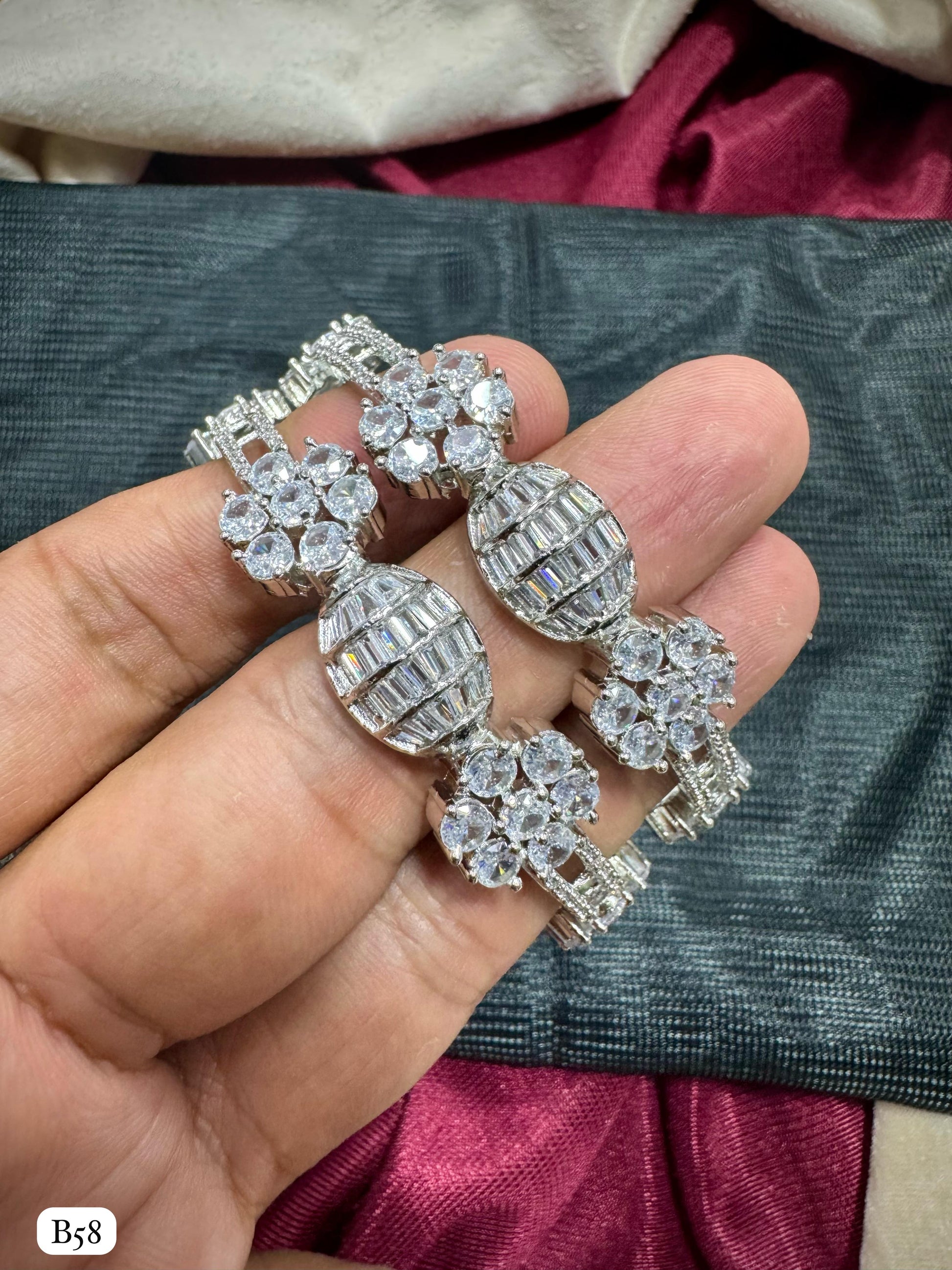 Enhance your outfit with our elegant Silver Plated American Diamond Bangles. Made with high quality silver plating and sparkling American diamonds, these bangles exude sophistication and luxury. Add a touch of glamour to any occasion with these beautiful bangles.