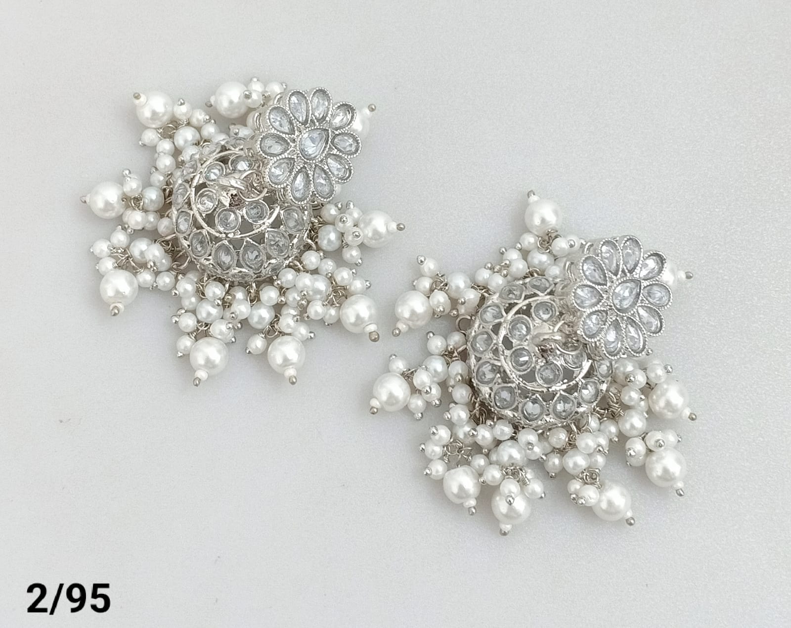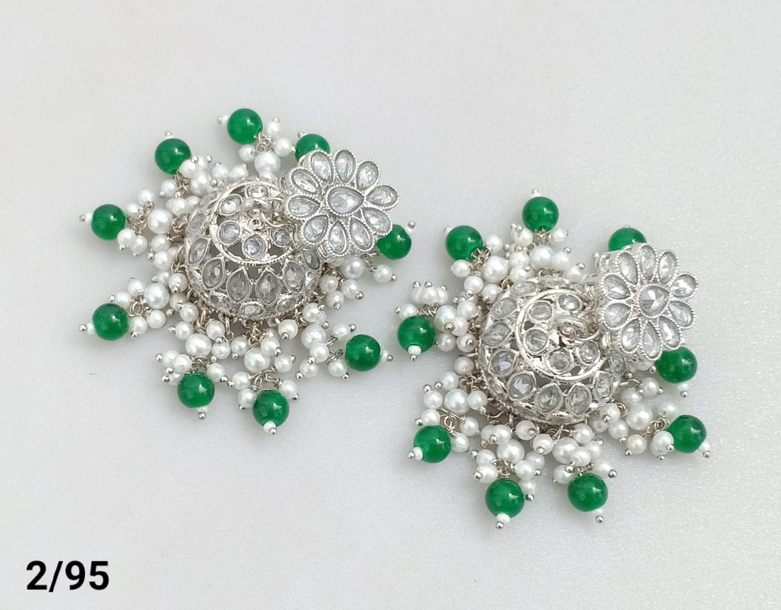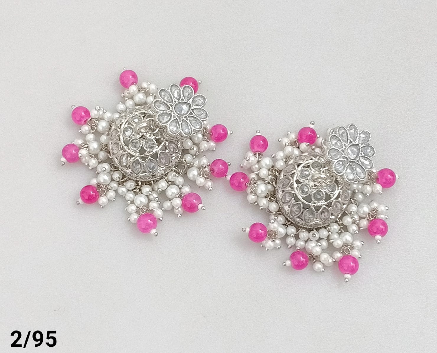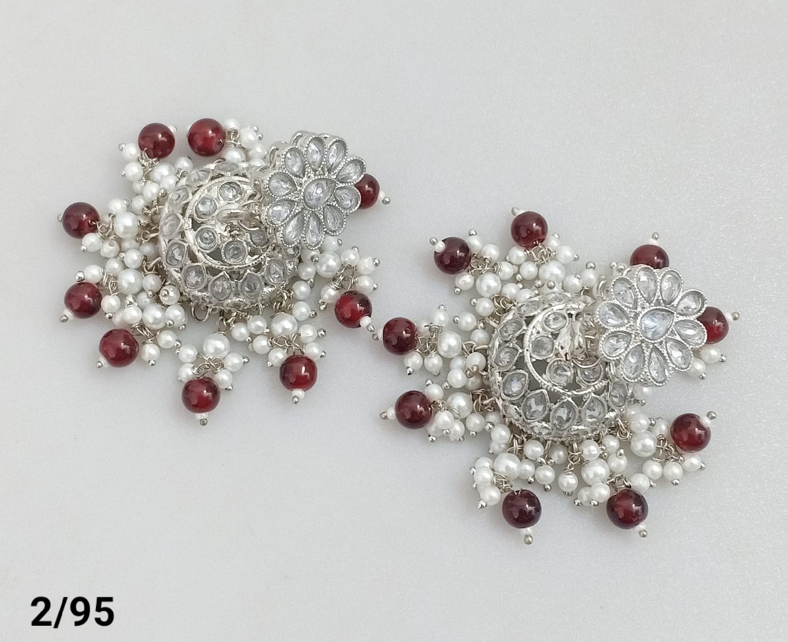 This silver-plated jhumki set showcases detailed artistry and a refined finish, perfect for complementing traditional attire with sophistication and grace.