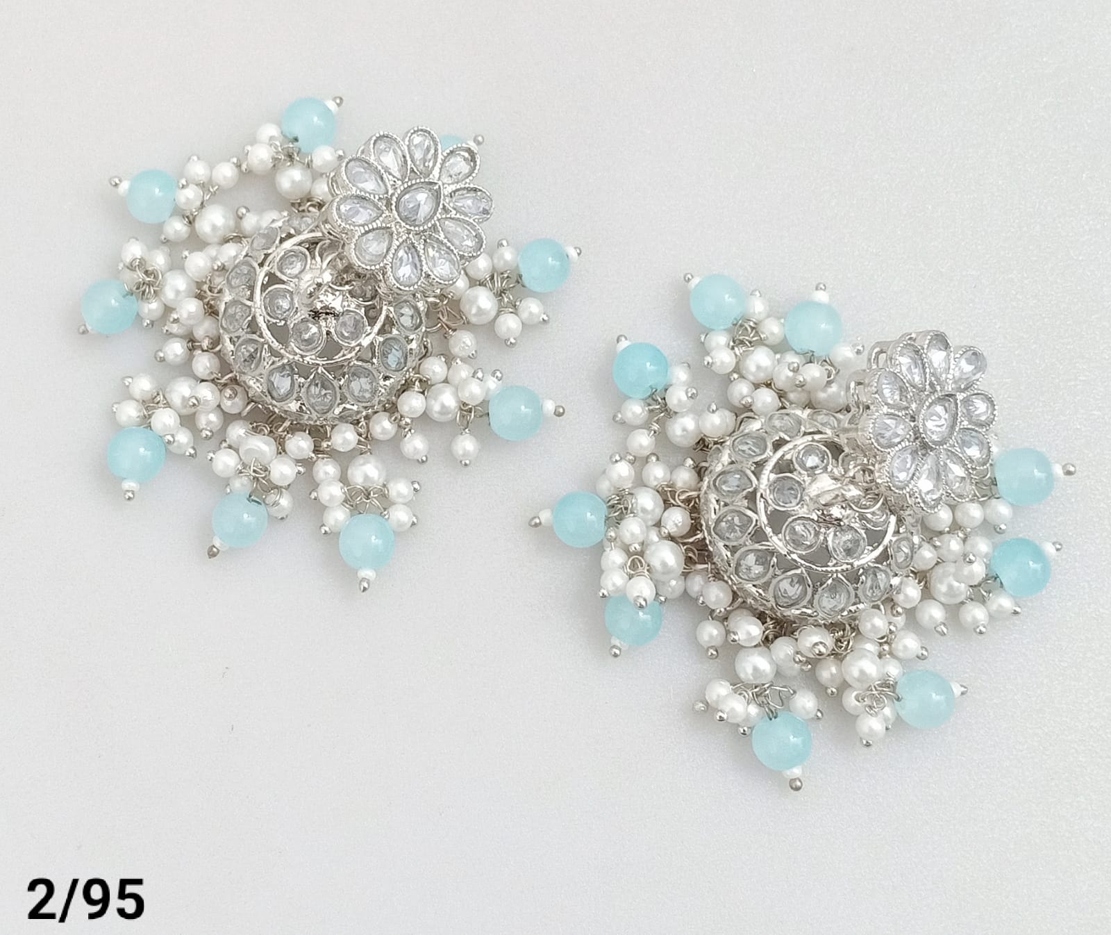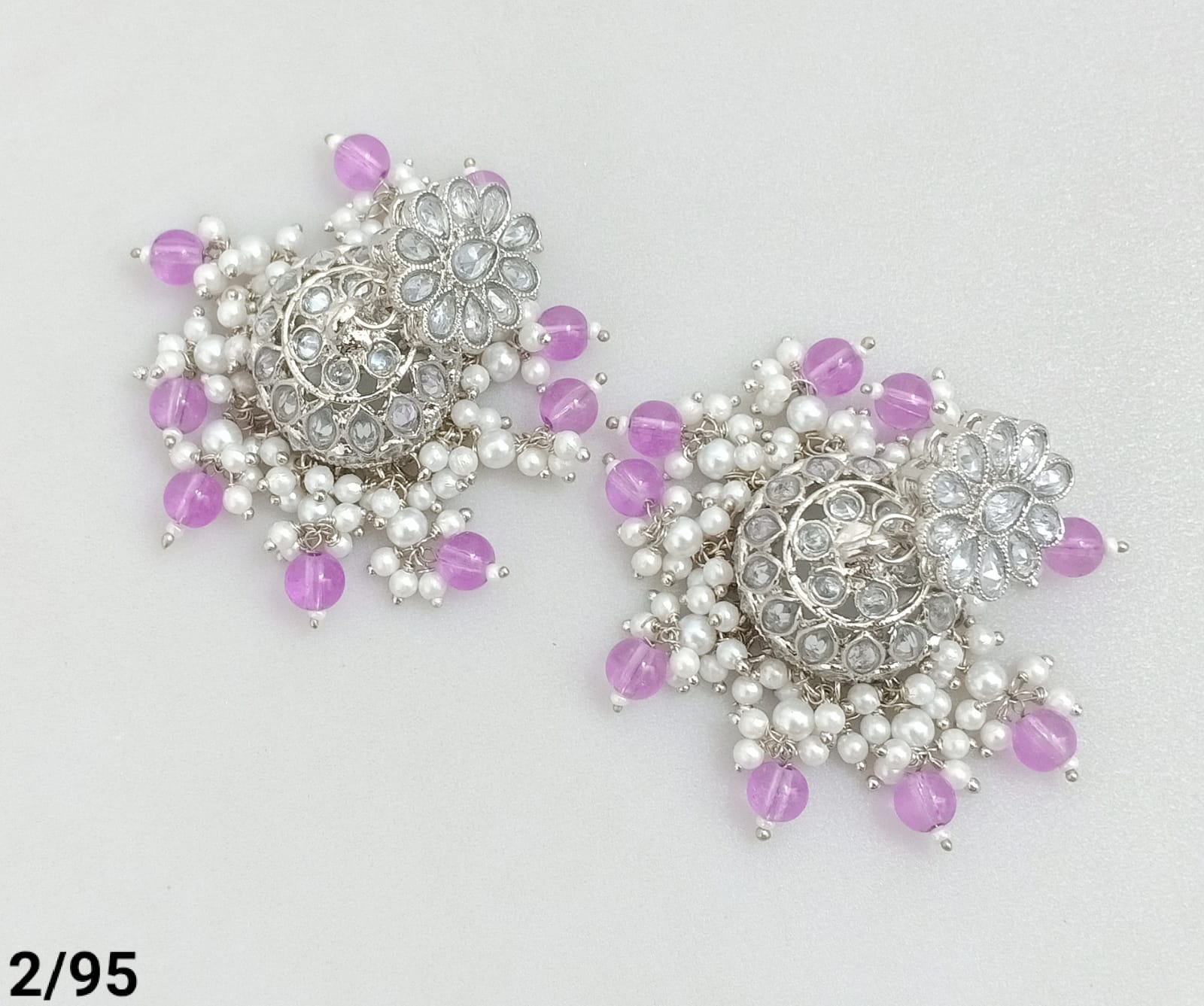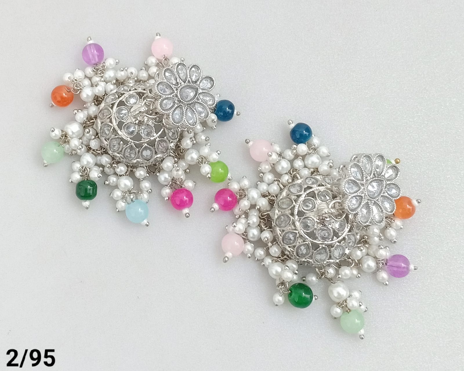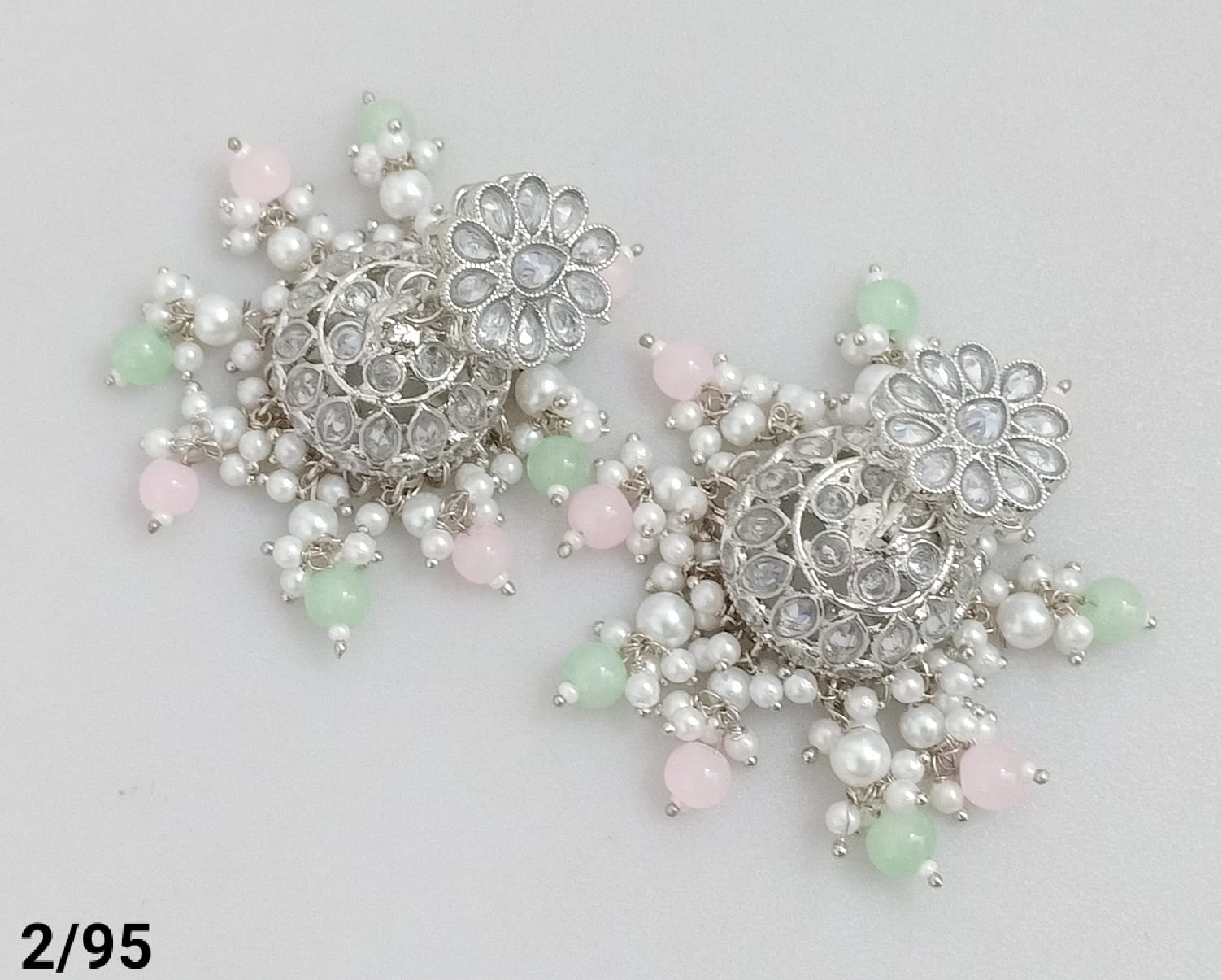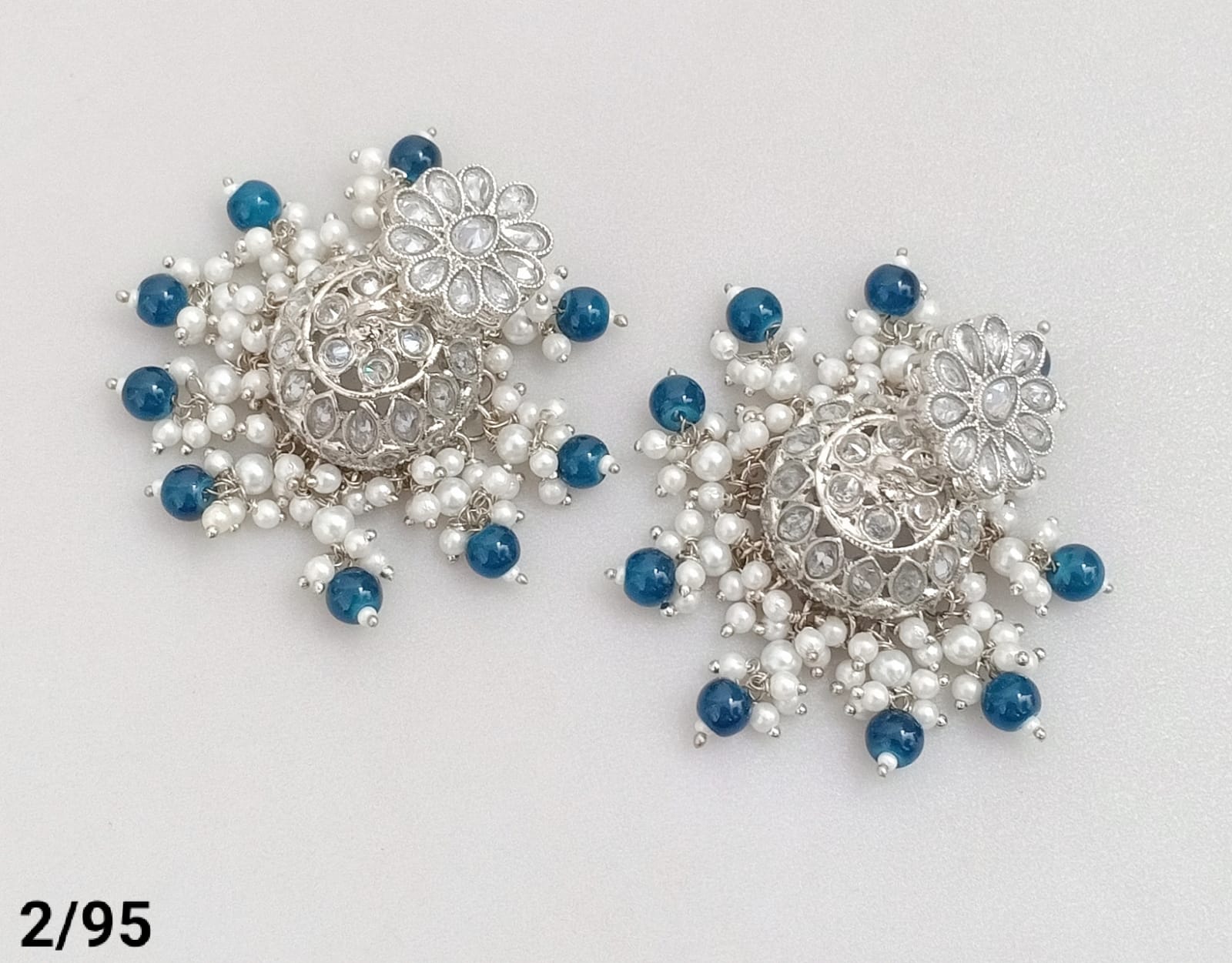 This silver-plated jhumki set showcases detailed artistry and a refined finish, perfect for complementing traditional attire with sophistication and grace.