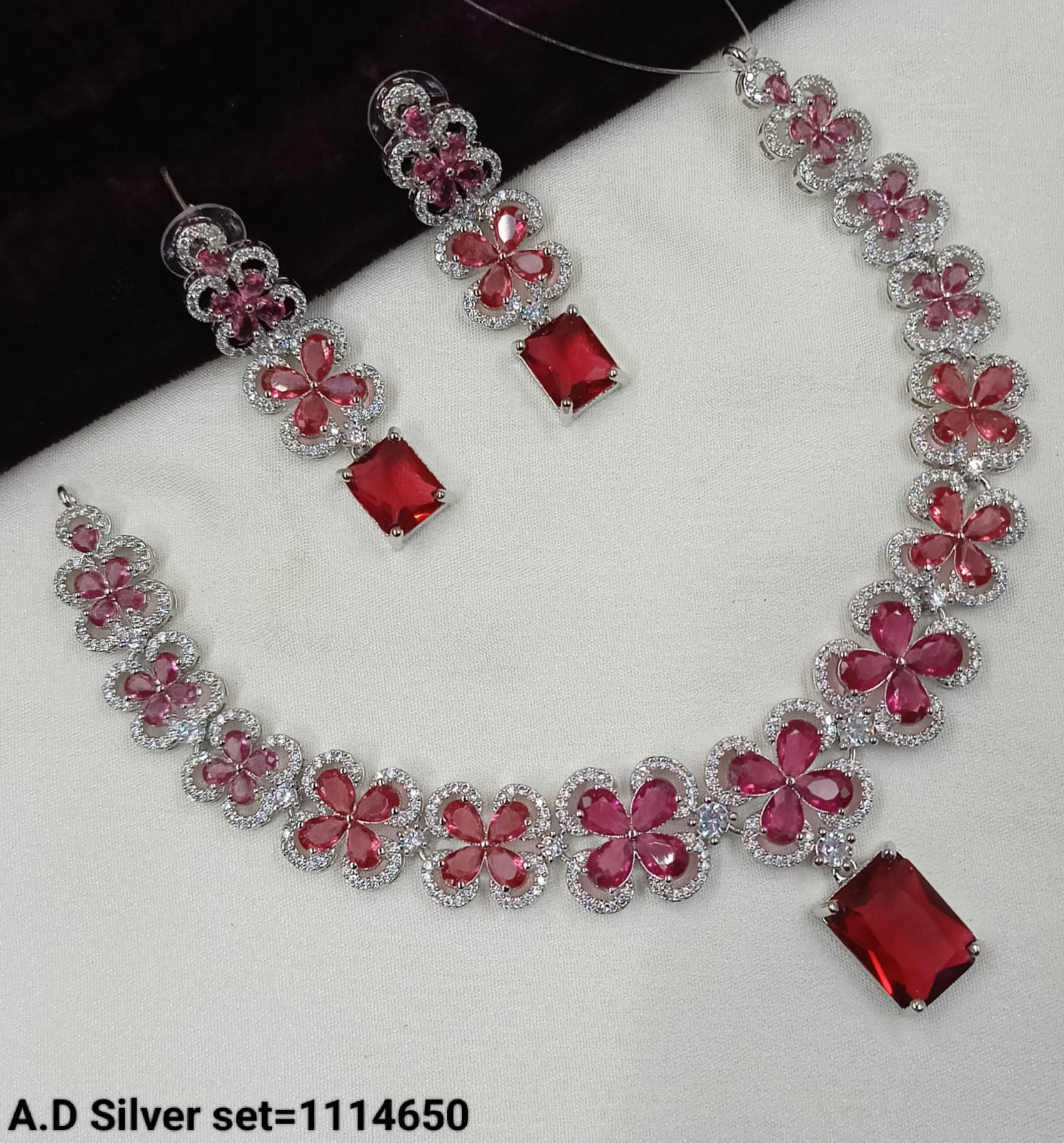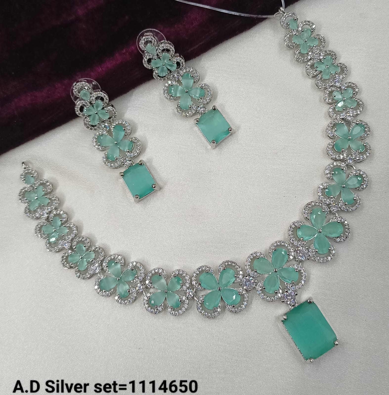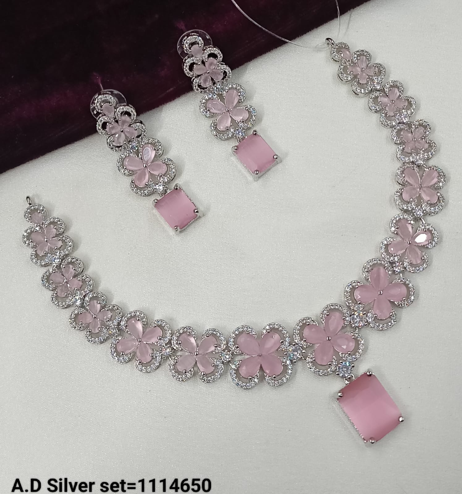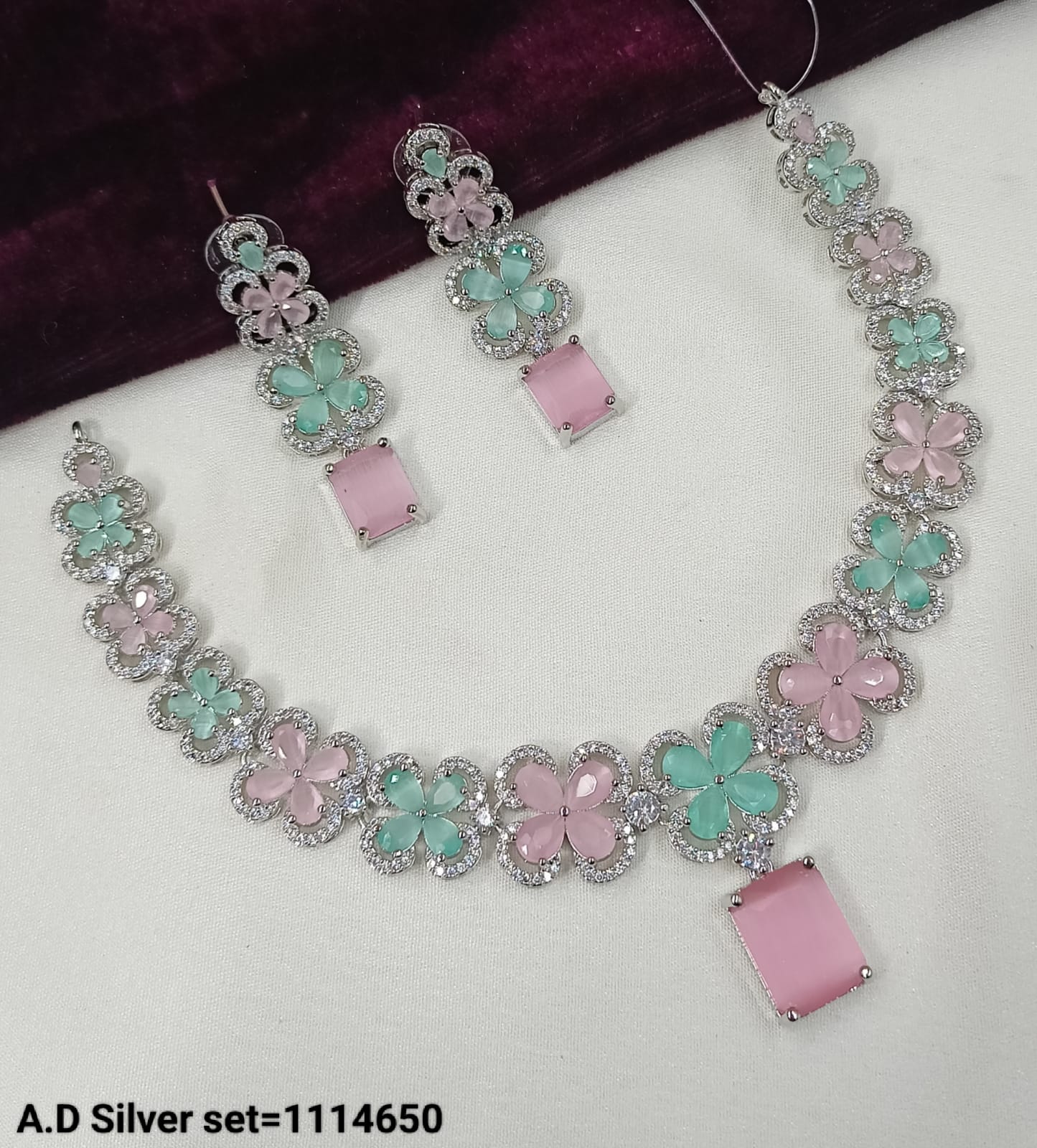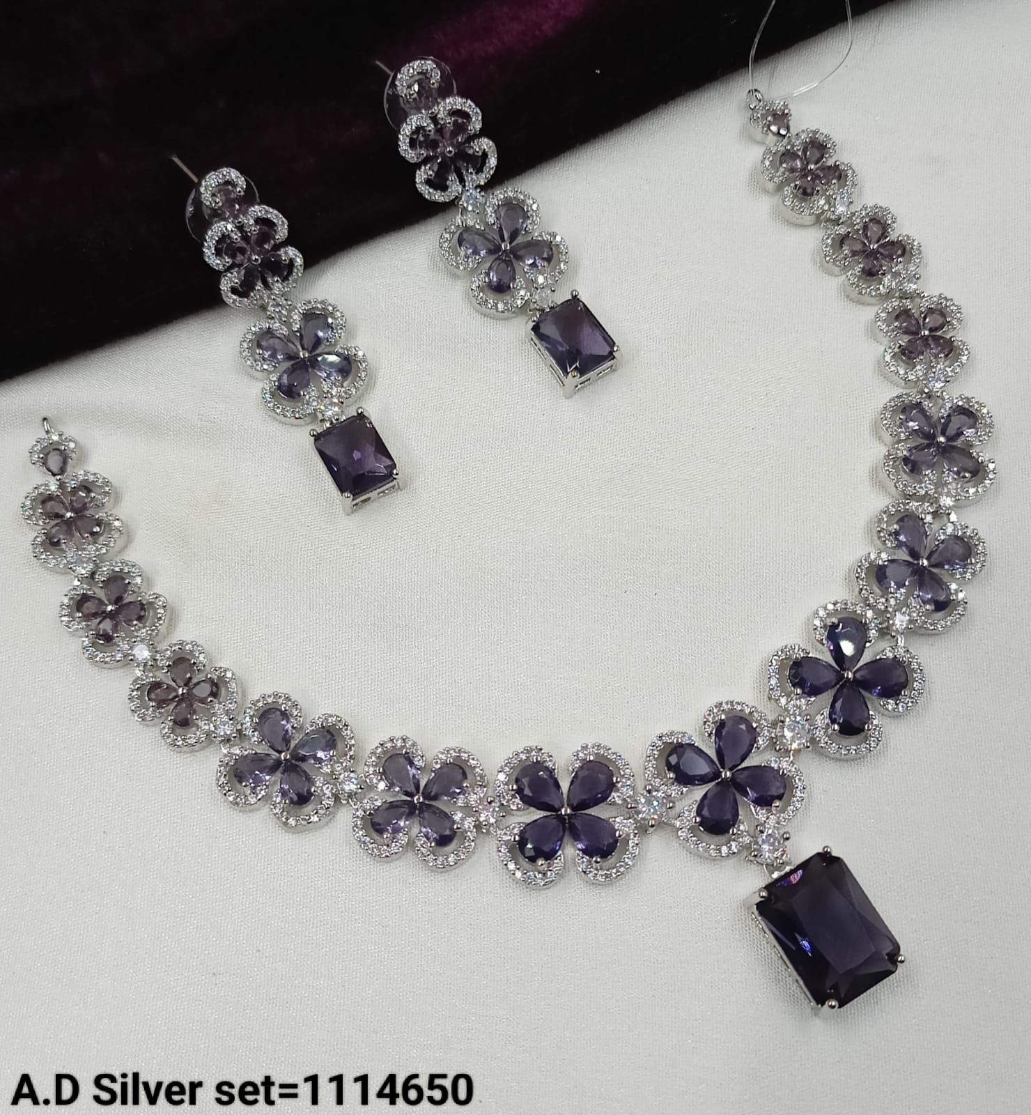 This exquisite jewellery set features a silver-tone finish adorned with sparkling American diamonds, combining elegance with timeless craftsmanship.