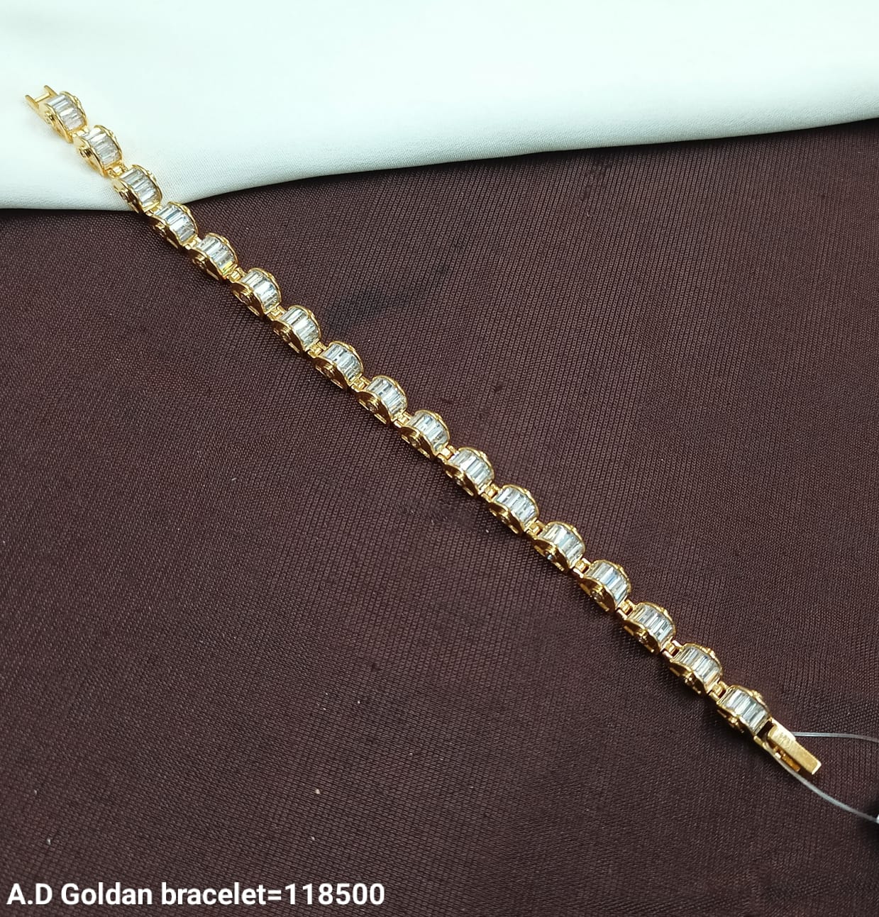 Elevate your accessory game with this Modern A.D. Golden Bracelet featuring elegant baguette-cut American Diamonds. The clean, structured design adds a contemporary touch to traditional gold-toned jewelry. Each stone is meticulously set in a rounded rectangular bezel, offering a sleek and refined aesthetic. Lightweight and comfortable, this bracelet is perfect for both daily wear and special occasions where subtle sophistication is key.