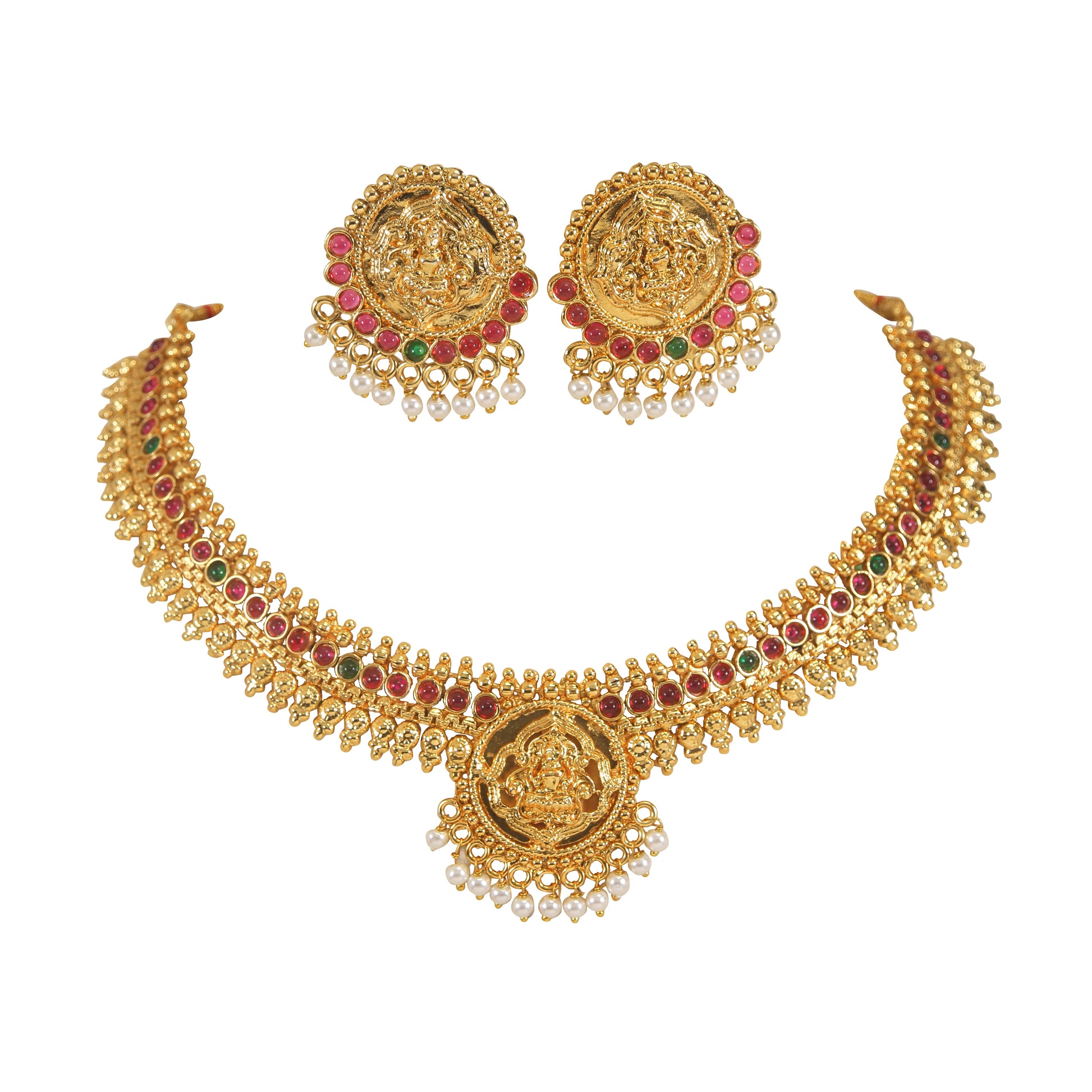 South Indian Traditional Gold Plated Laxami Necklace Pearl Dropped Temple Jewellery Set With Earrings For Women And Girls