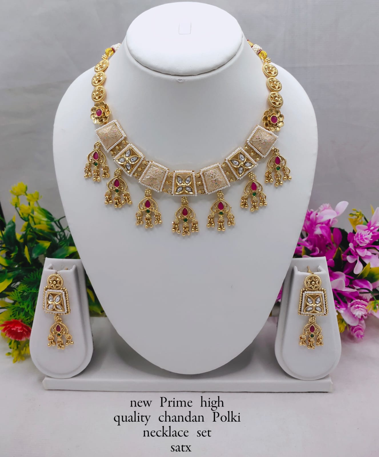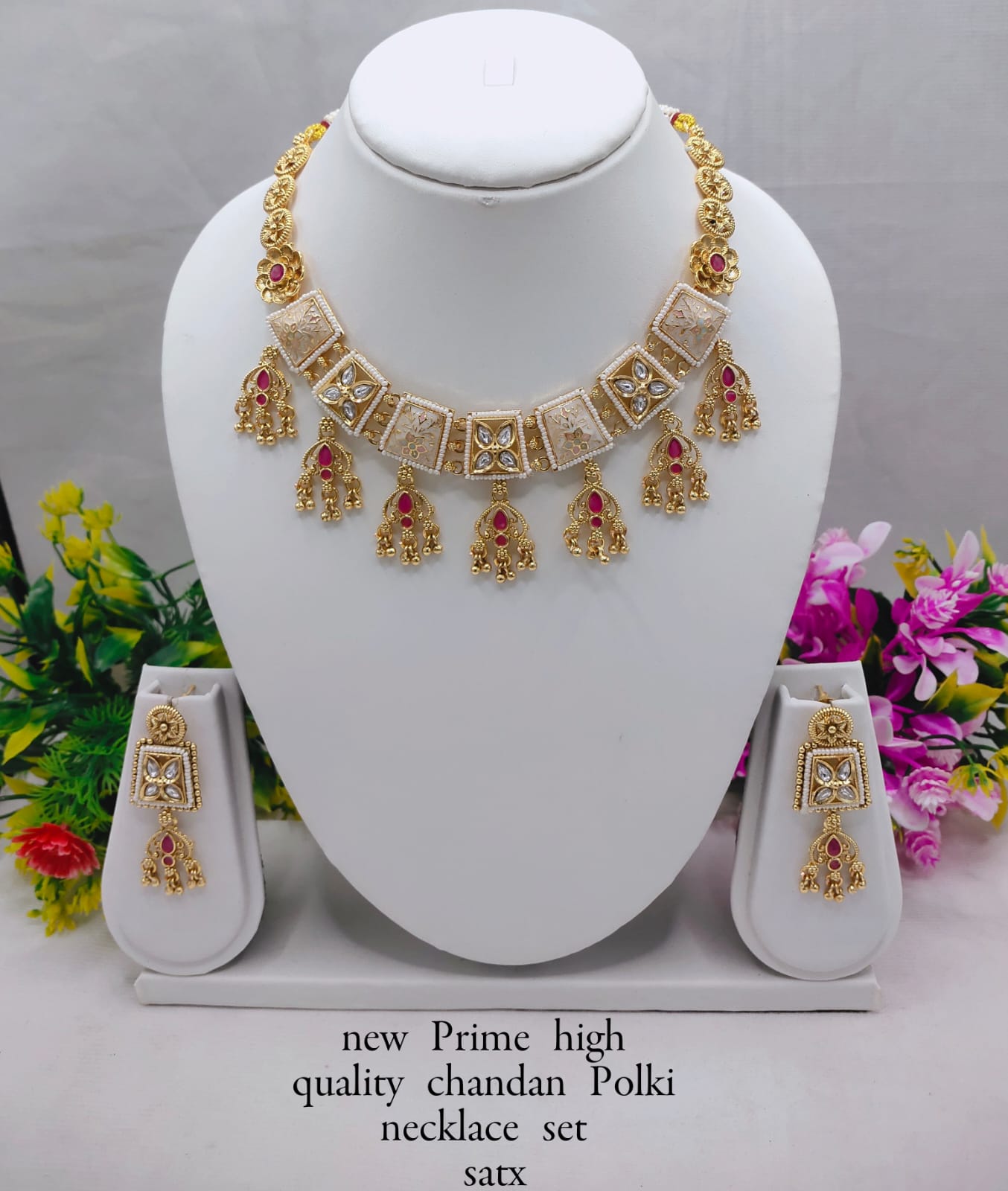Step into elegance with the Square Motif Chandan Polki Necklace Set from Lucentemarket. Crafted with precision on a high-quality copper base, this statement piece features unique square motifs detailed with Chandan Polki stones and intricate handwork. The set is completed with beautifully coordinated jhumka earrings, making it perfect for weddings, festive occasions, and traditional gatherings. Each square pendant is delicately adorned with floral engravings and colored stone accents, adding a regal charm to your ethnic attire.