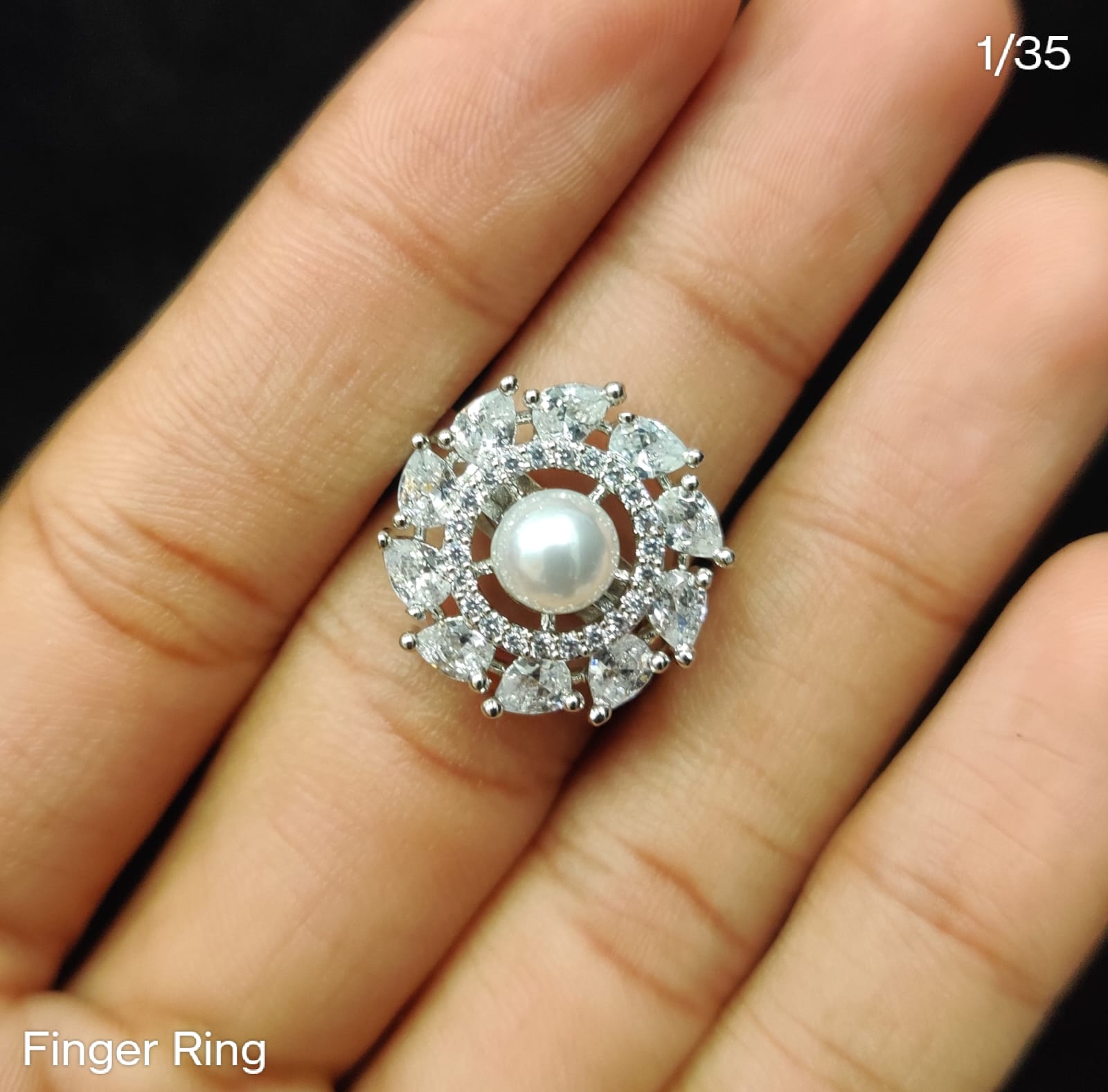 Statement Pearl Center CZ Finger Ring – Adjustable Floral Design