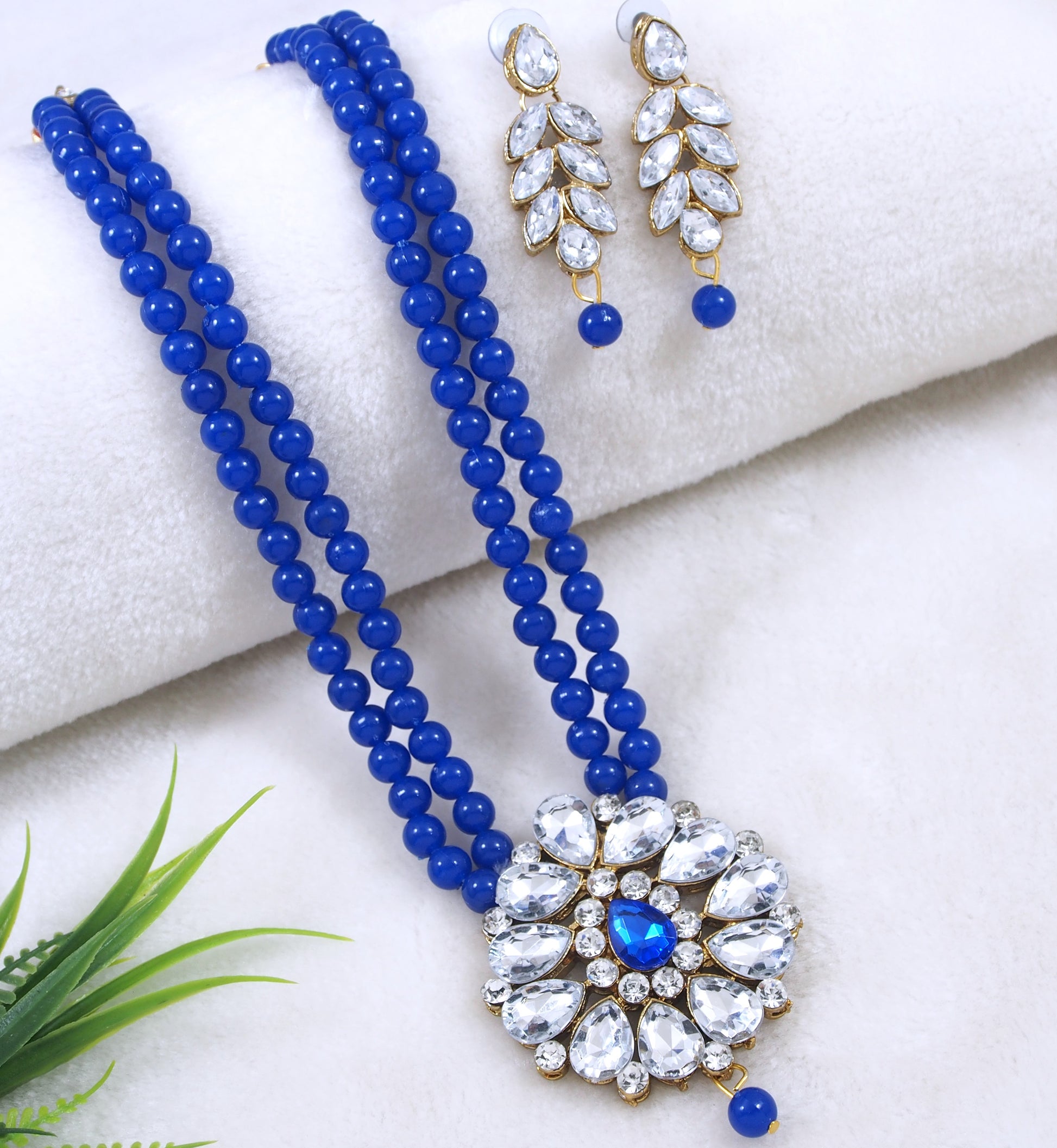 Add elegance to your festive and bridal look with this double-layer beaded necklace set, featuring a beautifully designed stone-studded pendant and matching earrings. The vibrant beads paired with sparkling stones make this set a perfect accessory for weddings, receptions, parties, and cultural celebrations. Crafted with premium materials for durability and shine, this set combines traditional artistry with contemporary appeal, ensuring you stand out on any occasion.