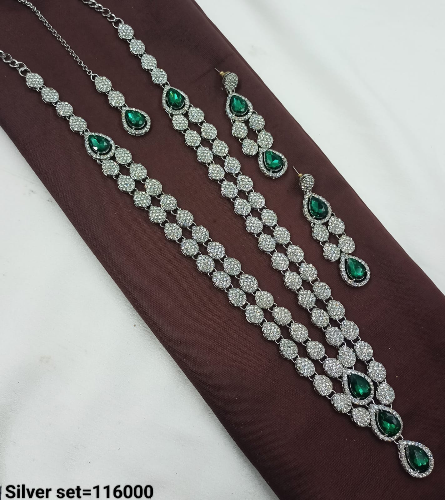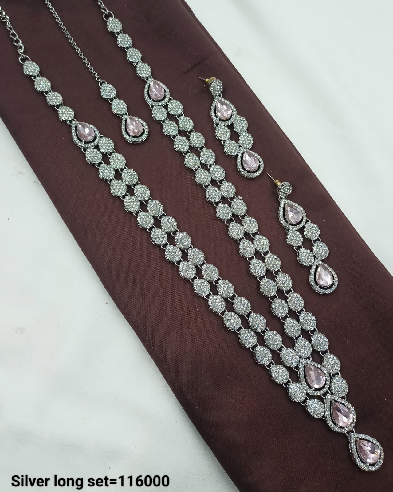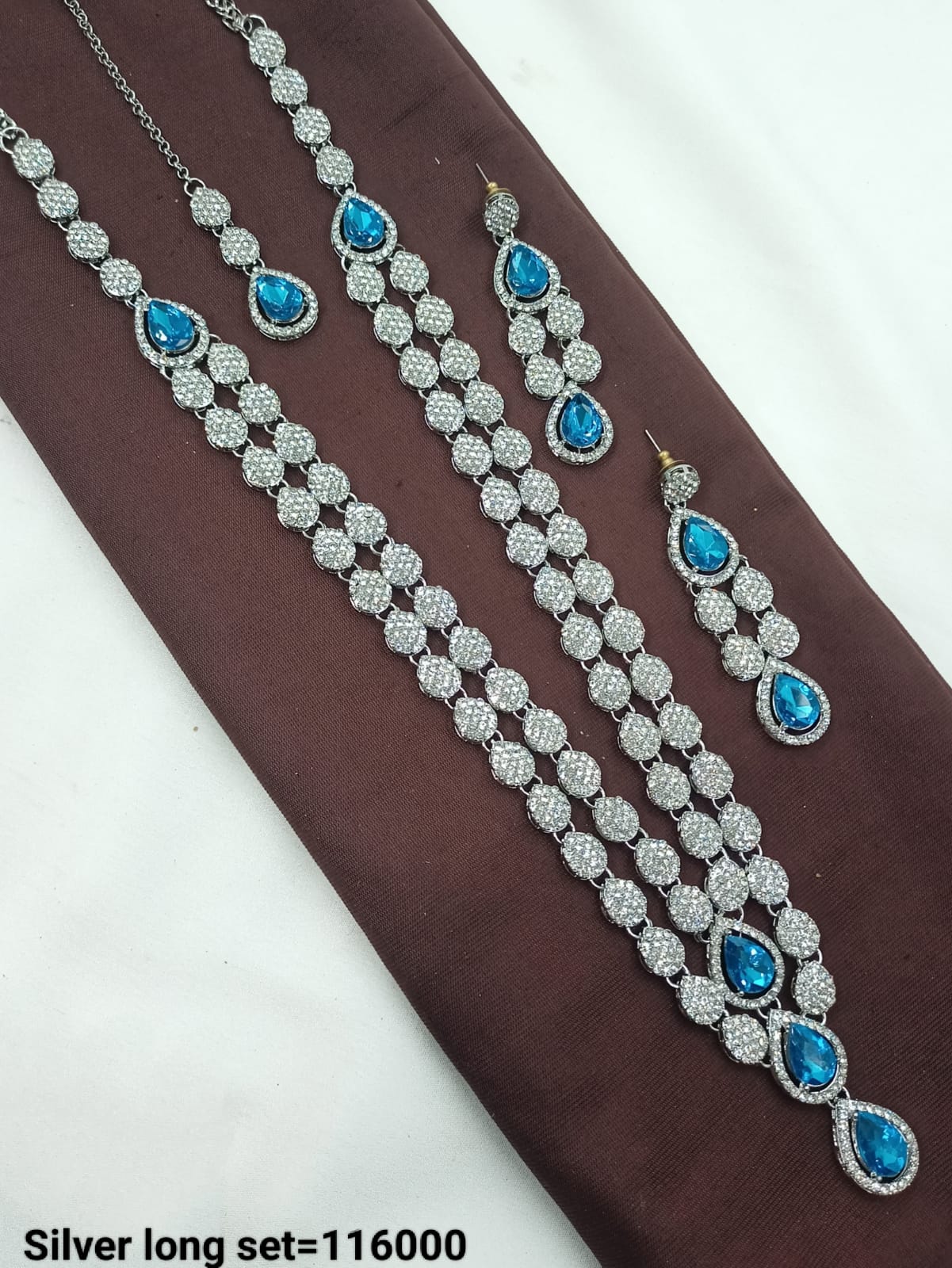 Elevate your elegance with this Teardrop Stone & CZ Silver Long Necklace Set, designed for weddings, parties, and festive occasions. Featuring shimmering cubic zirconia stones intricately set in a silver finish, paired with teardrop-shaped centerpiece stones, this long necklace set offers a perfect blend of sophistication and charm. Comes with matching earrings for a complete, coordinated look.