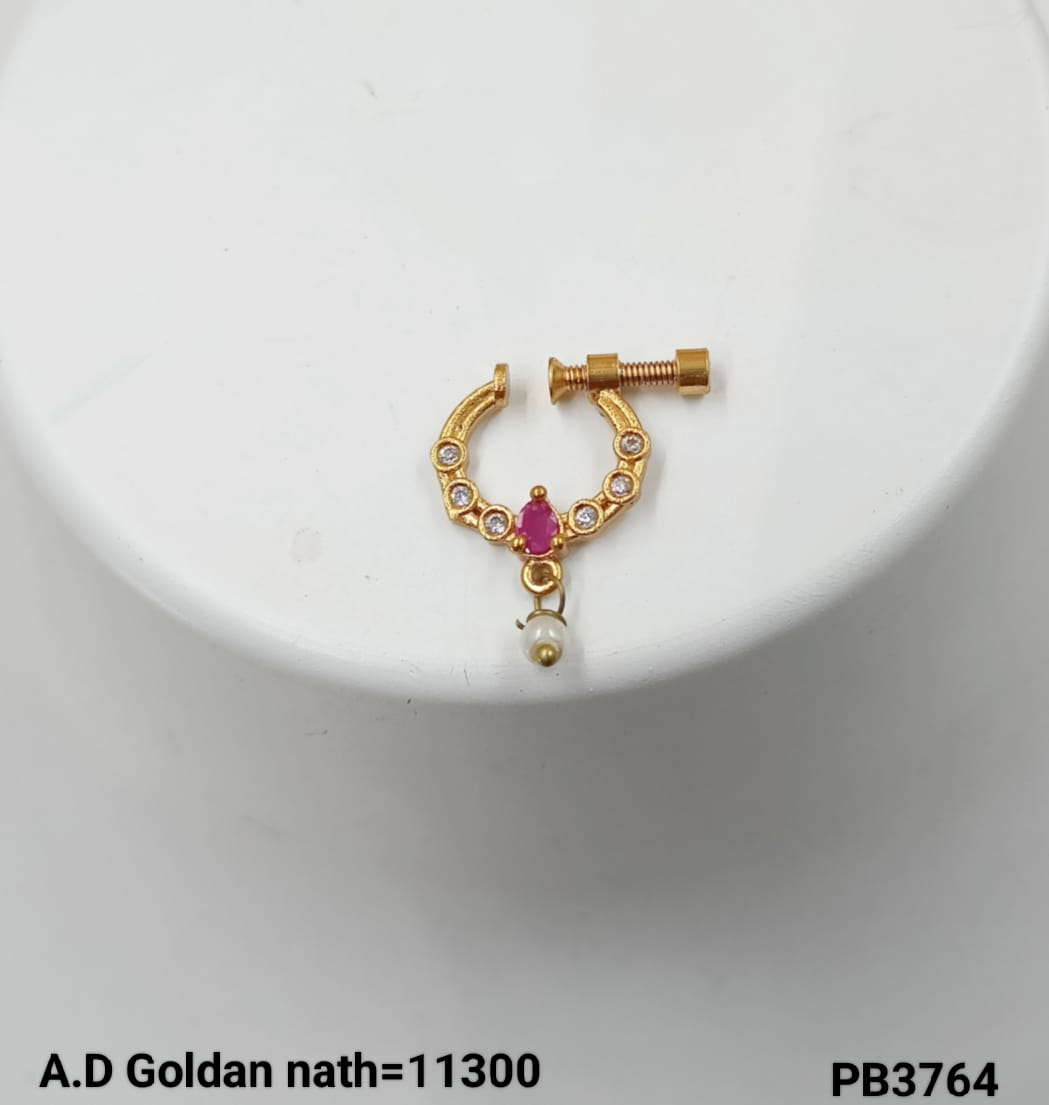 This nose pin features a traditional and ethnic design, expertly crafted with gold plating and adorned with a delicate pearl, offering a classic yet elegant accessory.