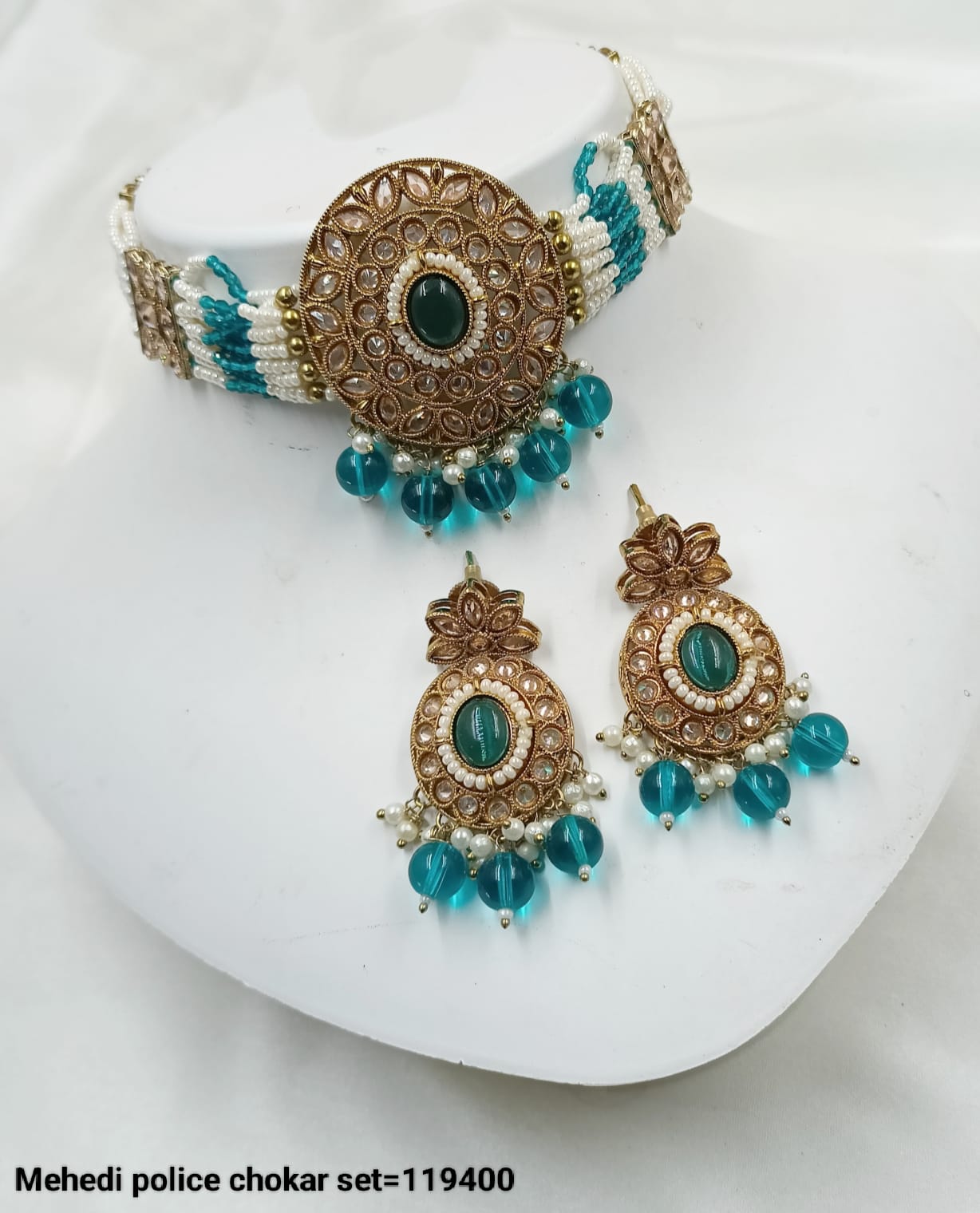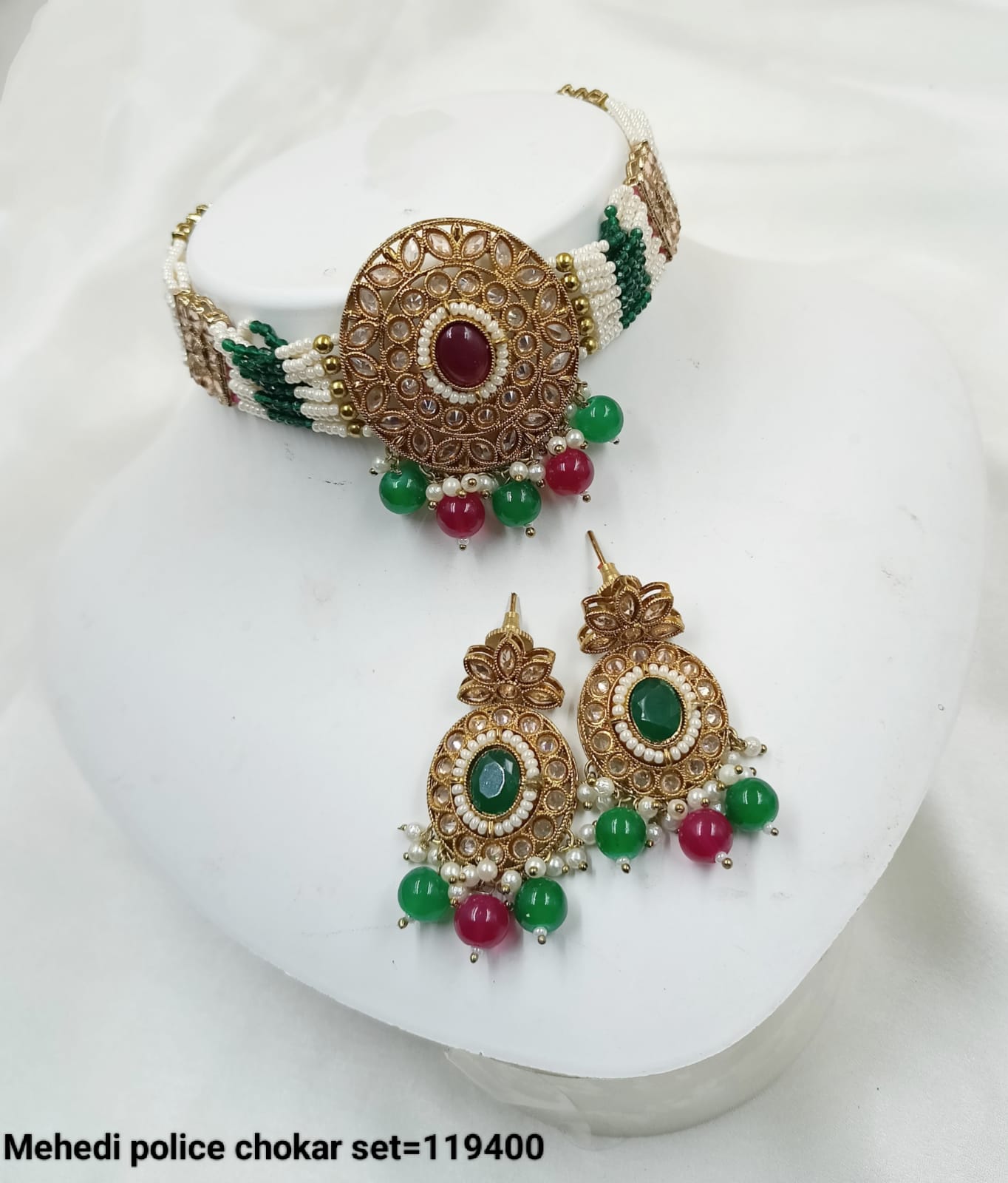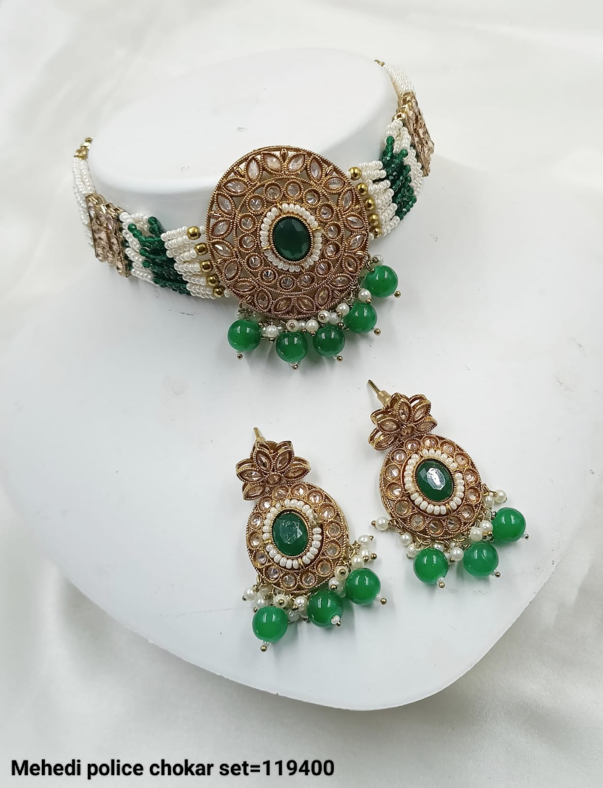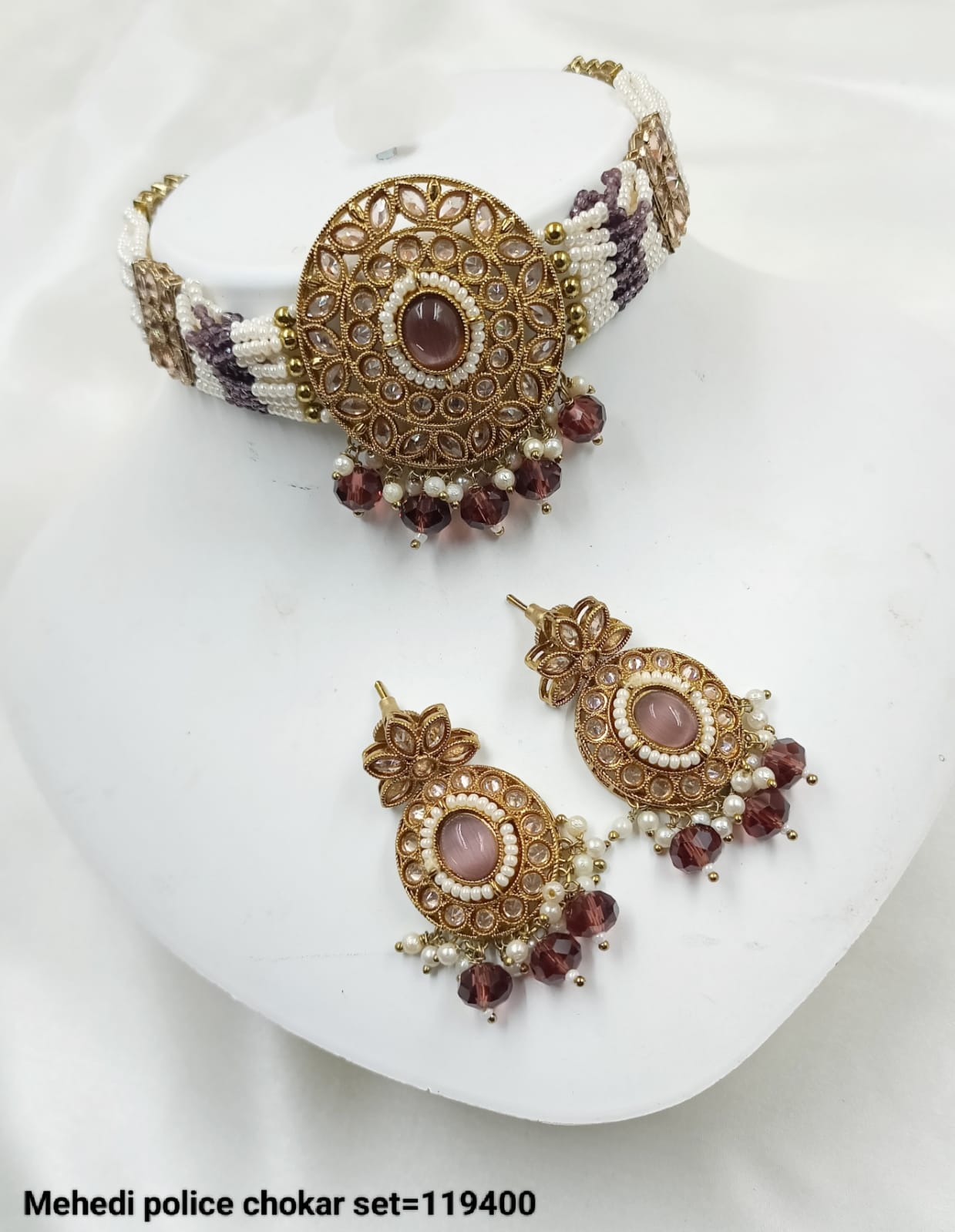 This exquisite choker necklace set features a traditional design with an antique gold plating, showcasing timeless elegance and craftsmanship.