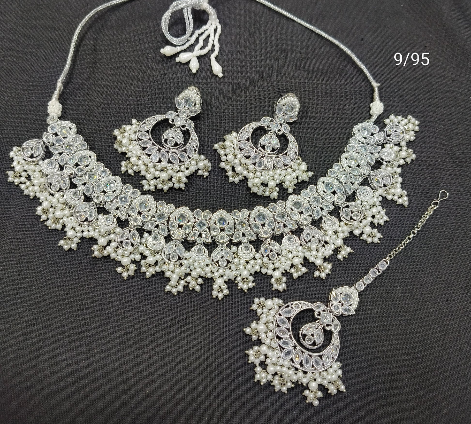 This Traditional Choker Necklace Set includes exquisitely crafted Chandbali earrings and a matching Mangtikka, designed to enhance your ethnic wardrobe with elegance and cultural richness. Ideal for weddings and festive occasions, this set combines intricate craftsmanship with timeless style, offering a sophisticated accessory that complements traditional attire flawlessly.