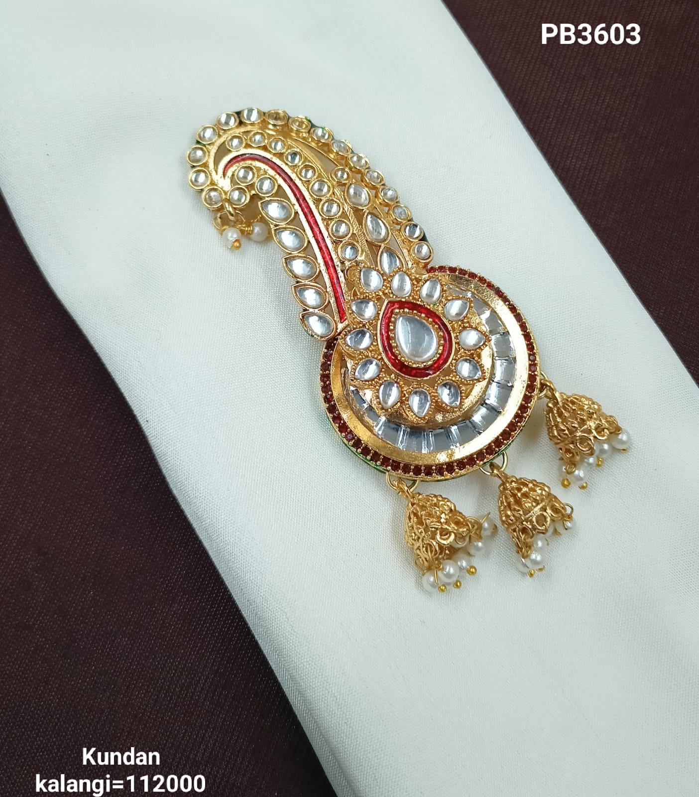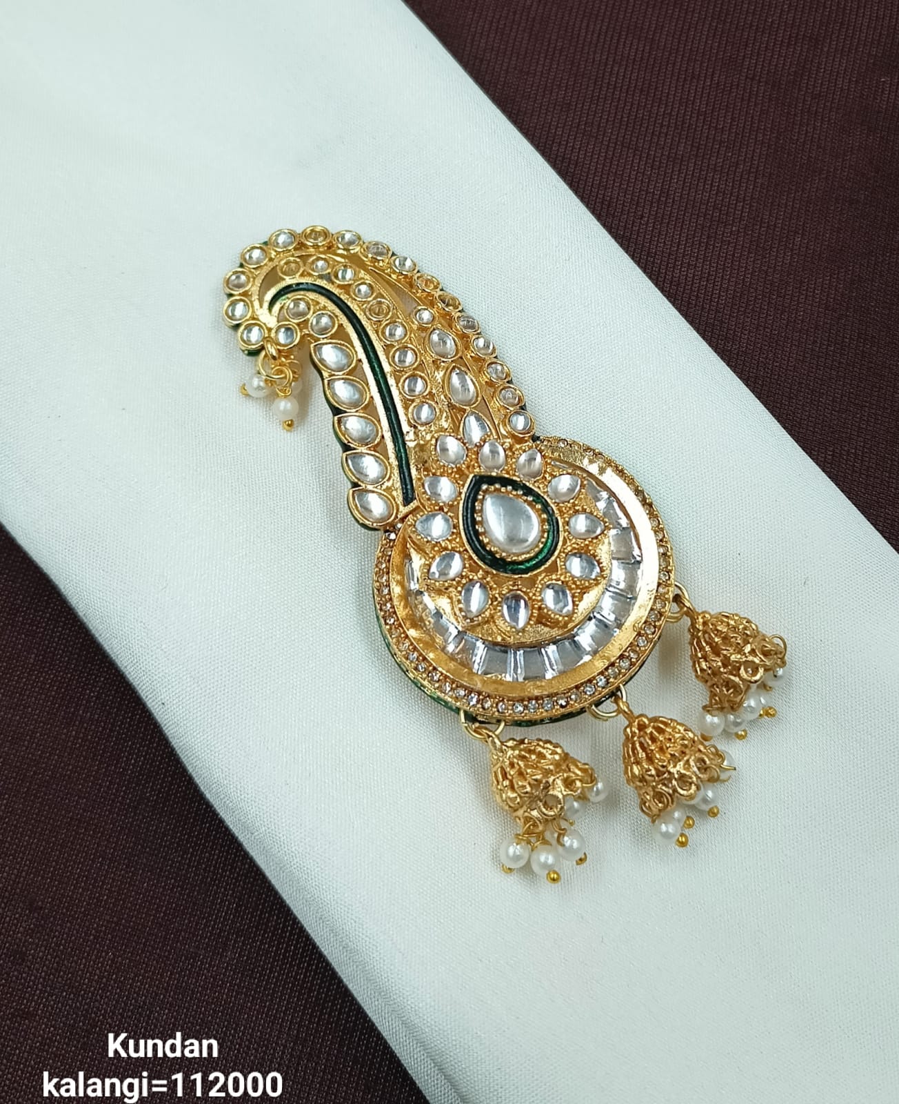 Elevate your wedding ensemble with this stunning Traditional CZ Kalangi with Pearl Jhumki, designed especially for grooms who value heritage and elegance. Crafted with precision, this kalangi features sparkling Cubic Zirconia (CZ) stones set in a regal gold-toned finish. The intricate design is enhanced by delicate pearl jhumki drops, adding a royal charm to turbans or safa styles. Perfect for modern grooms who want to honor tradition in style.
