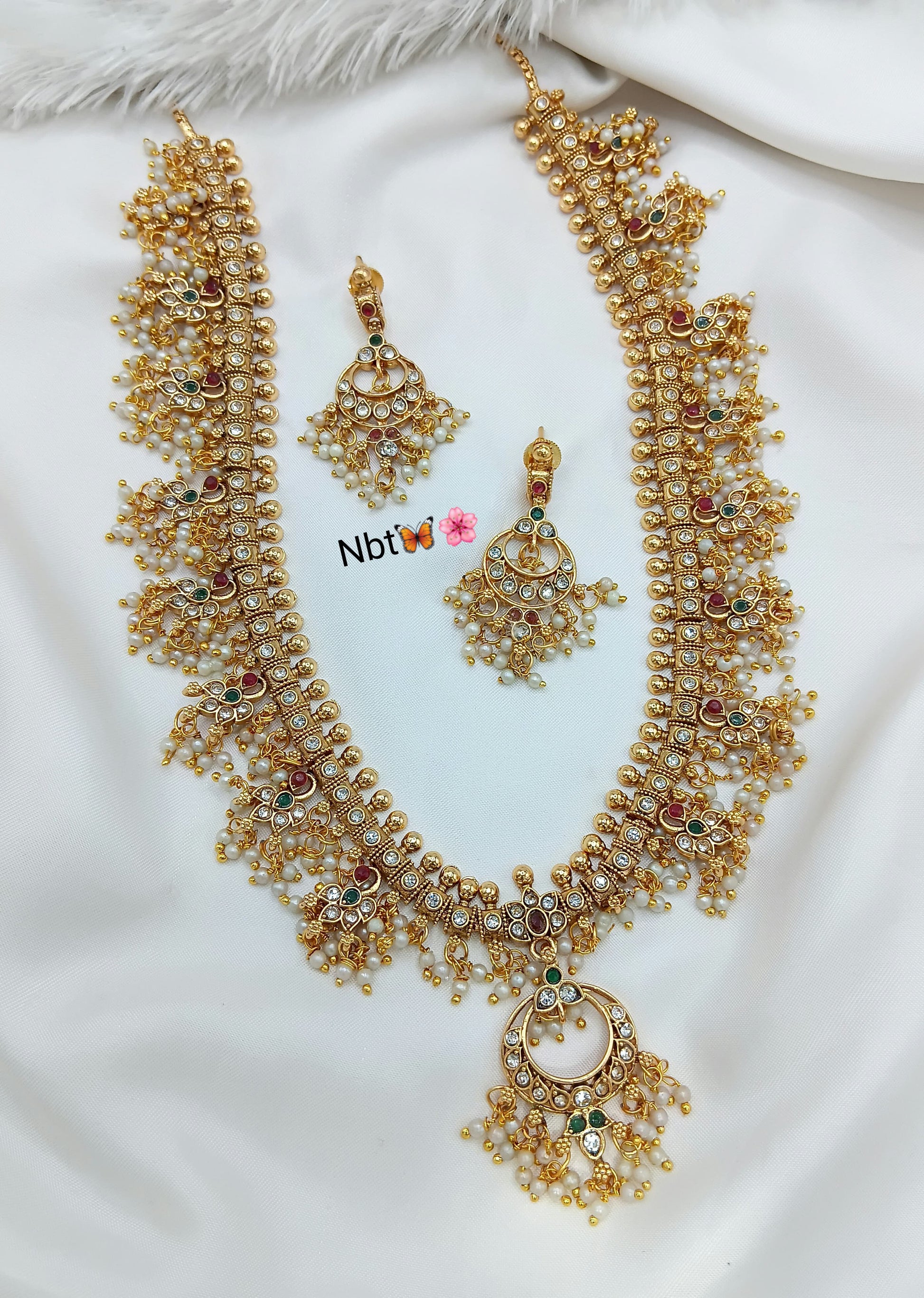 Elevate your ethnic elegance with this exquisite Traditional CZ Stone Gold Plated Bridal Necklace Set, beautifully handcrafted in a classic temple jewelry style. Adorned with high-quality Cubic Zirconia (CZ) stones, this set brings the perfect blend of tradition and sparkle to your special occasions. Designed for brides and festive wear, the necklace features intricate floral and paisley motifs with ruby red, emerald green, and white accents, giving it a regal and timeless appeal.