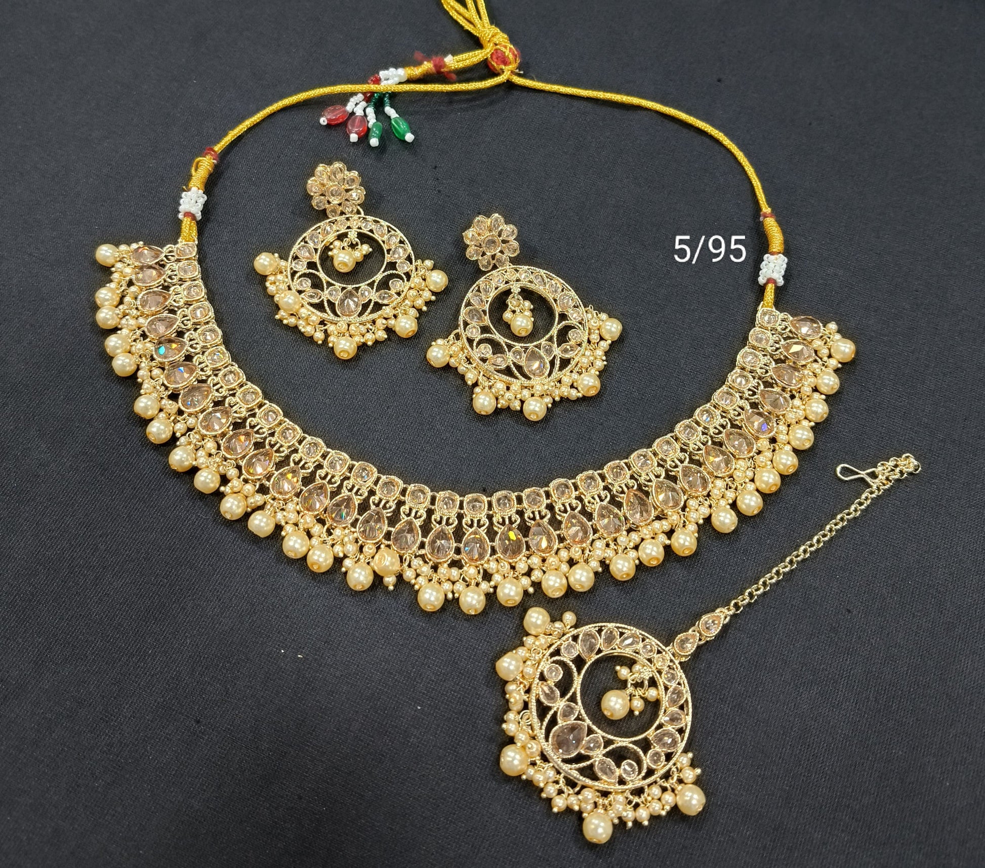 This traditional gold-plated choker necklace set features exquisite pearl embellishments, combining classic design with refined craftsmanship. Perfect for enhancing ethnic outfits, it offers a luxurious look suitable for weddings and special occasions. The intricate detailing and high-quality plating ensure durability and lasting shine, making it a valuable addition to your jewelry collection.