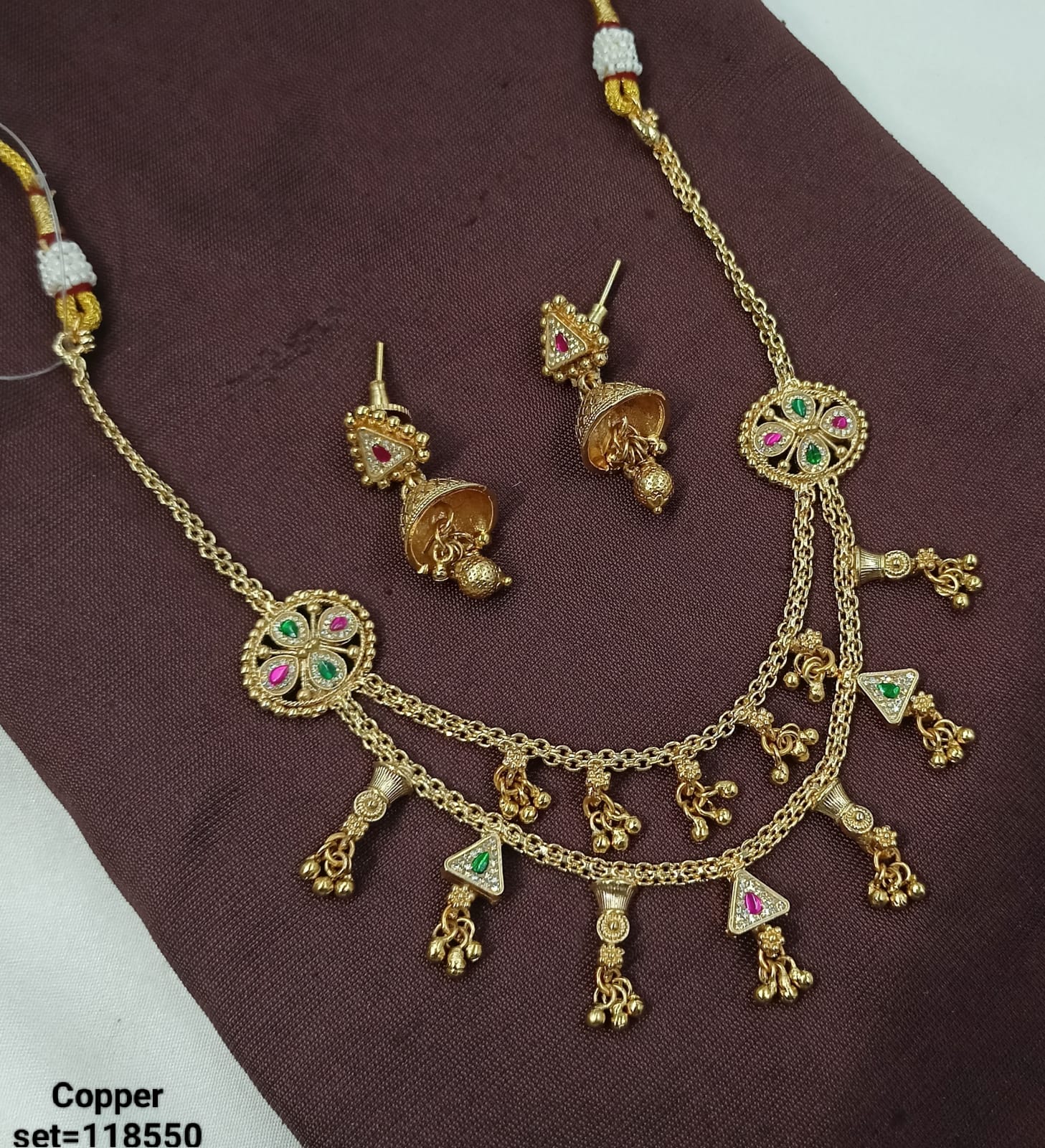 Elevate your ethnic look with this beautifully crafted traditional gold-plated copper necklace set, complete with matching jhumka earrings. Designed with intricate detailing and premium craftsmanship, this set is perfect for weddings, festivals, and special occasions. The layered chain and unique dangling charms add a touch of elegance, making it a must-have for your jewelry collection.