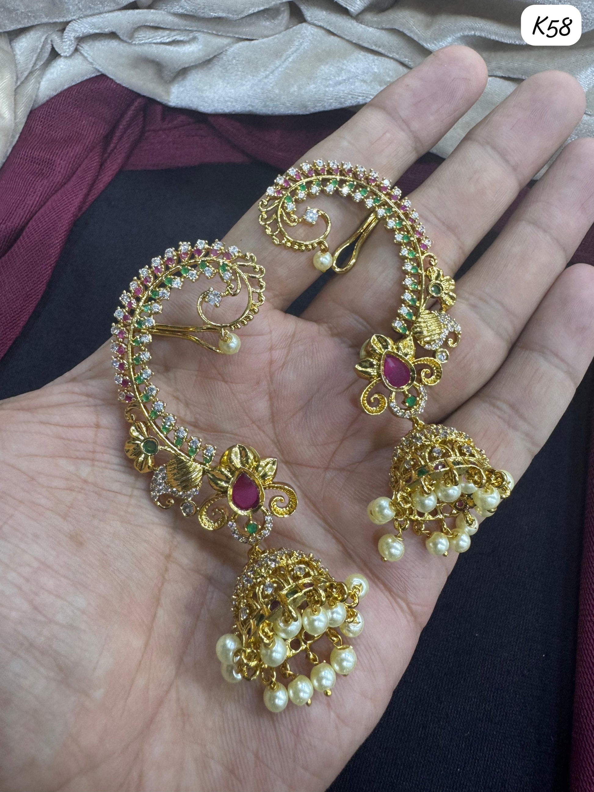 These traditional gold-plated floral AD earcuff earrings for women blend classic design with intricate detailing, offering an elegant accessory that enhances any traditional outfit with ease and sophistication.