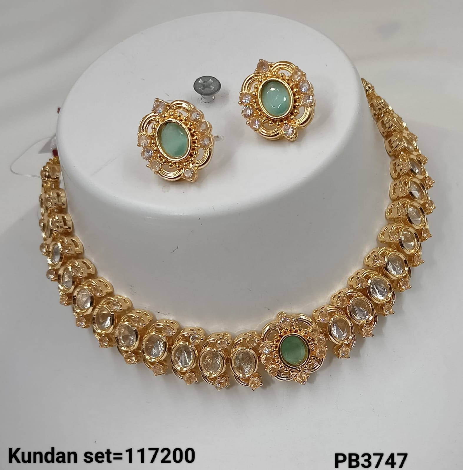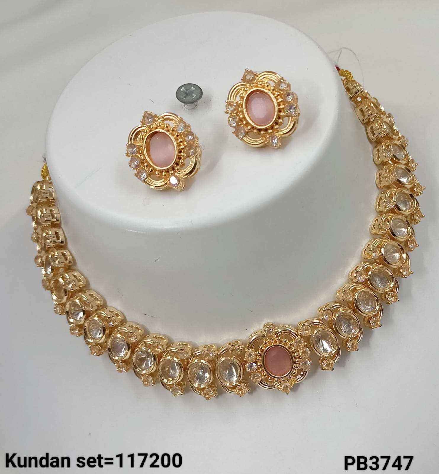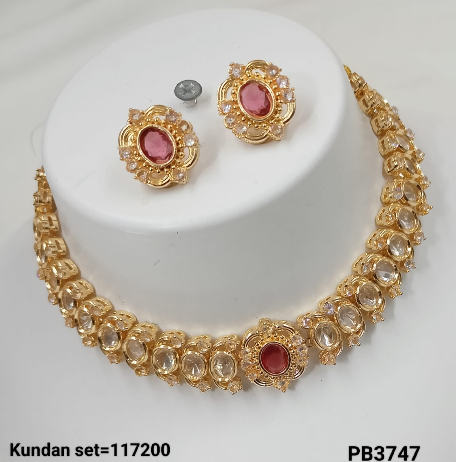 Exquisitely crafted, this necklace set features traditional gold plating combined with intricate Kundan work, embodying timeless elegance and expert craftsmanship.