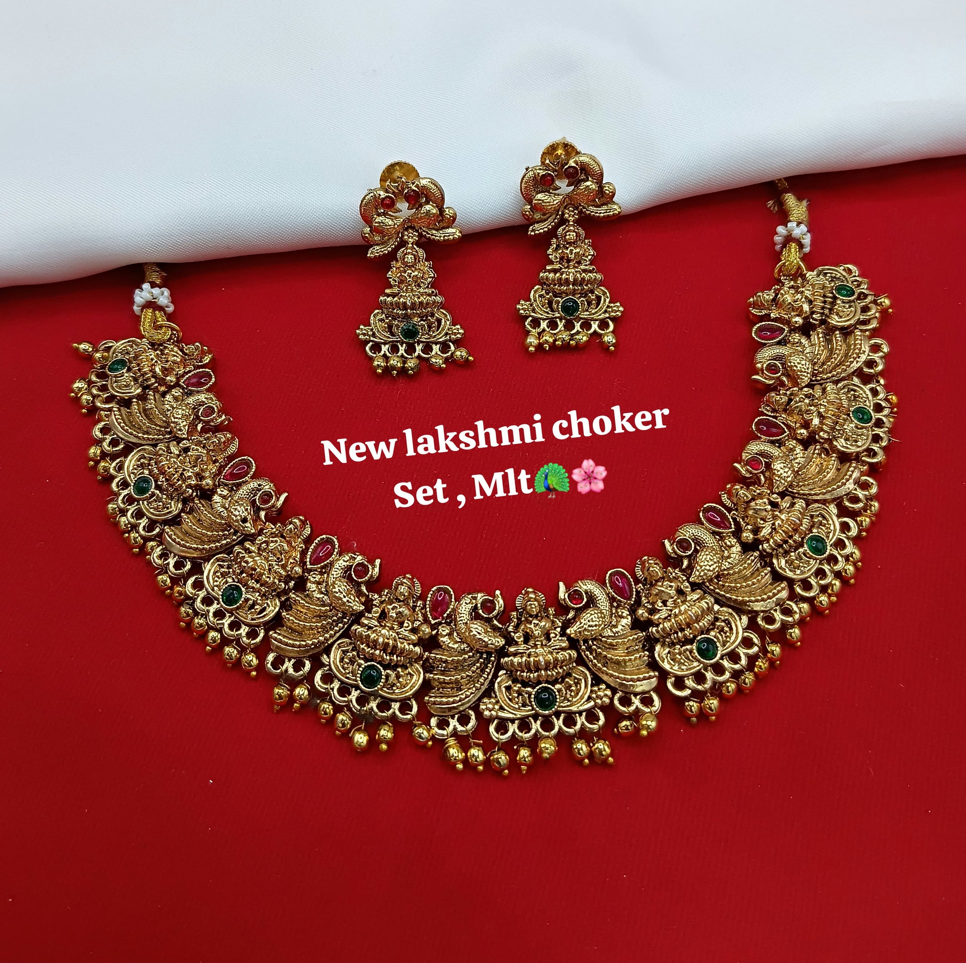 Celebrate tradition and elegance with this Lakshmi Temple Choker Necklace Set, exquisitely crafted with intricate goddess Lakshmi motifs and adorned with red and green stones. The design symbolizes prosperity and divinity, making it a perfect choice for brides and festive occasions. The choker is complemented with matching jhumka earrings, adding a touch of grandeur to any traditional attire. Whether paired with sarees, lehengas, or bridal outfits, this jewellery set brings out a regal and timeless charm that makes you stand out in every celebration.
