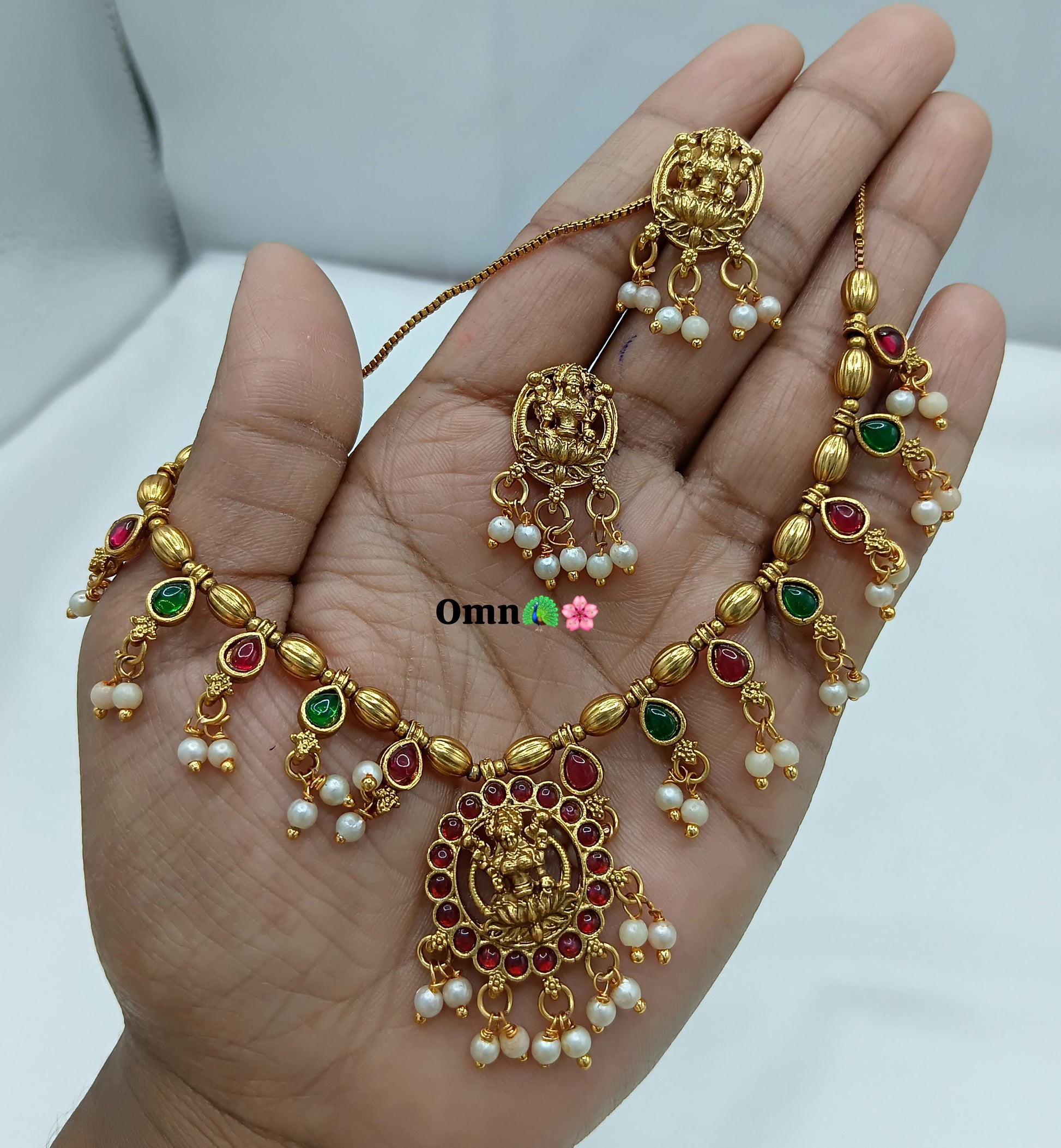 Bring divine grace and elegance to your style with this Lakshmi Temple Necklace Set, featuring a beautifully crafted Lakshmi pendant surrounded by traditional motifs. Accented with red and green stones along with delicate pearl drops, this jewellery set is a perfect blend of spiritual symbolism and timeless beauty. Paired with matching earrings, this necklace set is ideal for weddings, festive celebrations, and religious occasions.