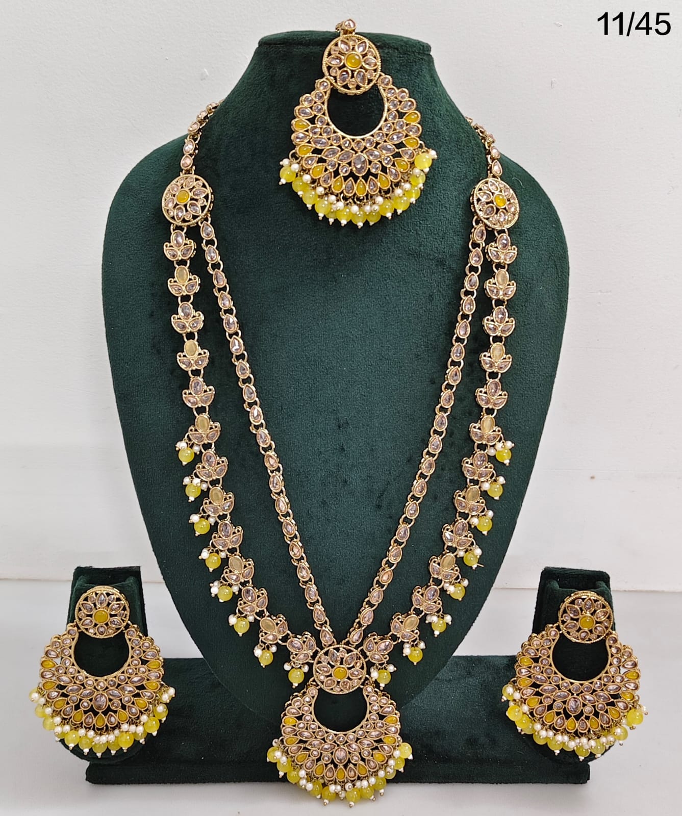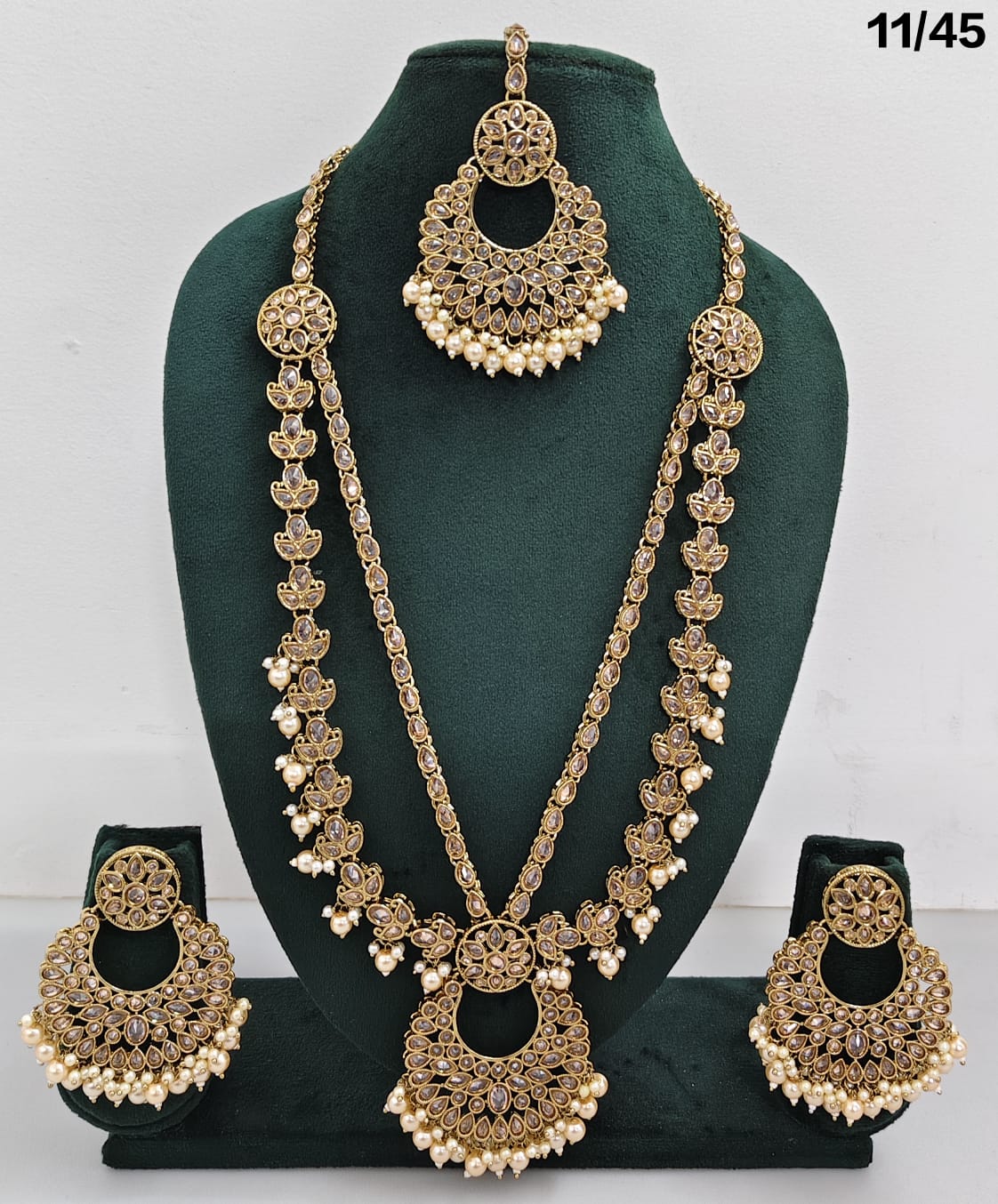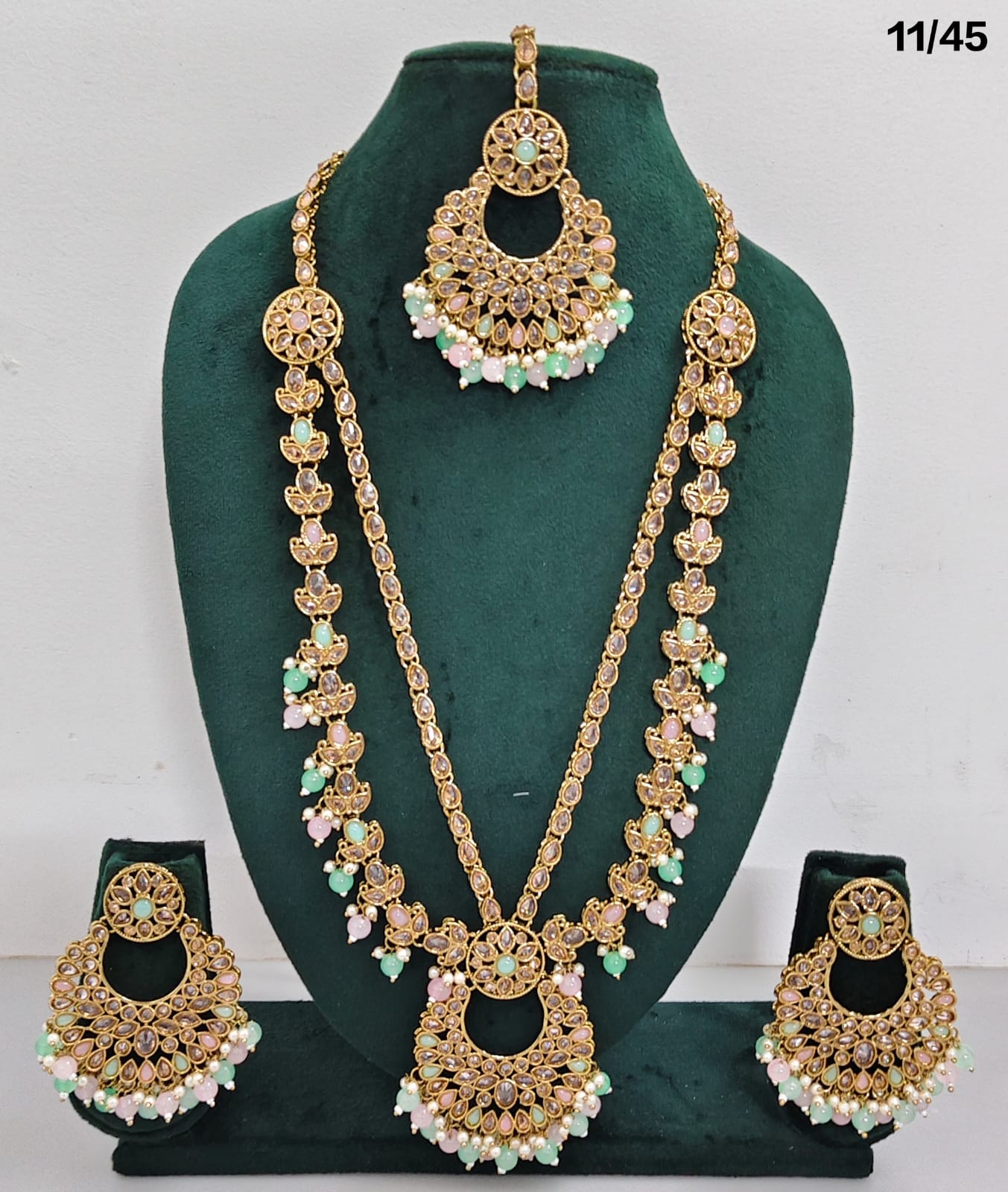 Turn heads at every celebration with this Traditional CZ Long Necklace Set, crafted with timeless elegance and attention to detail. The set features a beautifully patterned long necklace embellished with sparkling CZ stones and finished with delicate beaded drops. The coordinated earrings mirror the same intricate design, adding balance and charm to your overall look. Ideal for weddings, festive events, or cultural gatherings, this set perfectly blends traditional aesthetics with contemporary elegance.