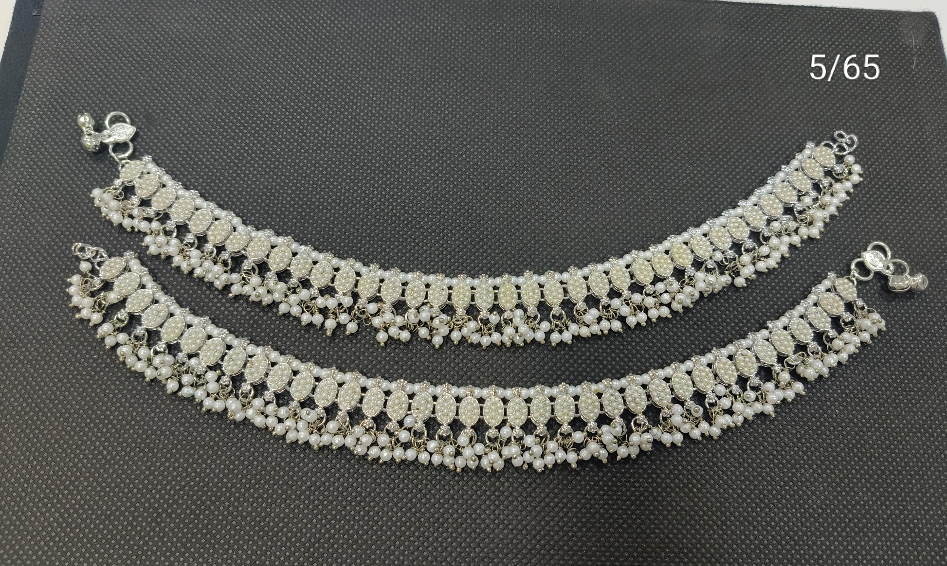 Enhance your ethnic look with this beautifully crafted traditional anklet set. Designed with intricate detailing, this pair features shimmering white stones and delicate pearl bead drops, creating an elegant and timeless appeal. Perfect for weddings, festivals, and traditional occasions, these anklets add a graceful touch to any outfit.