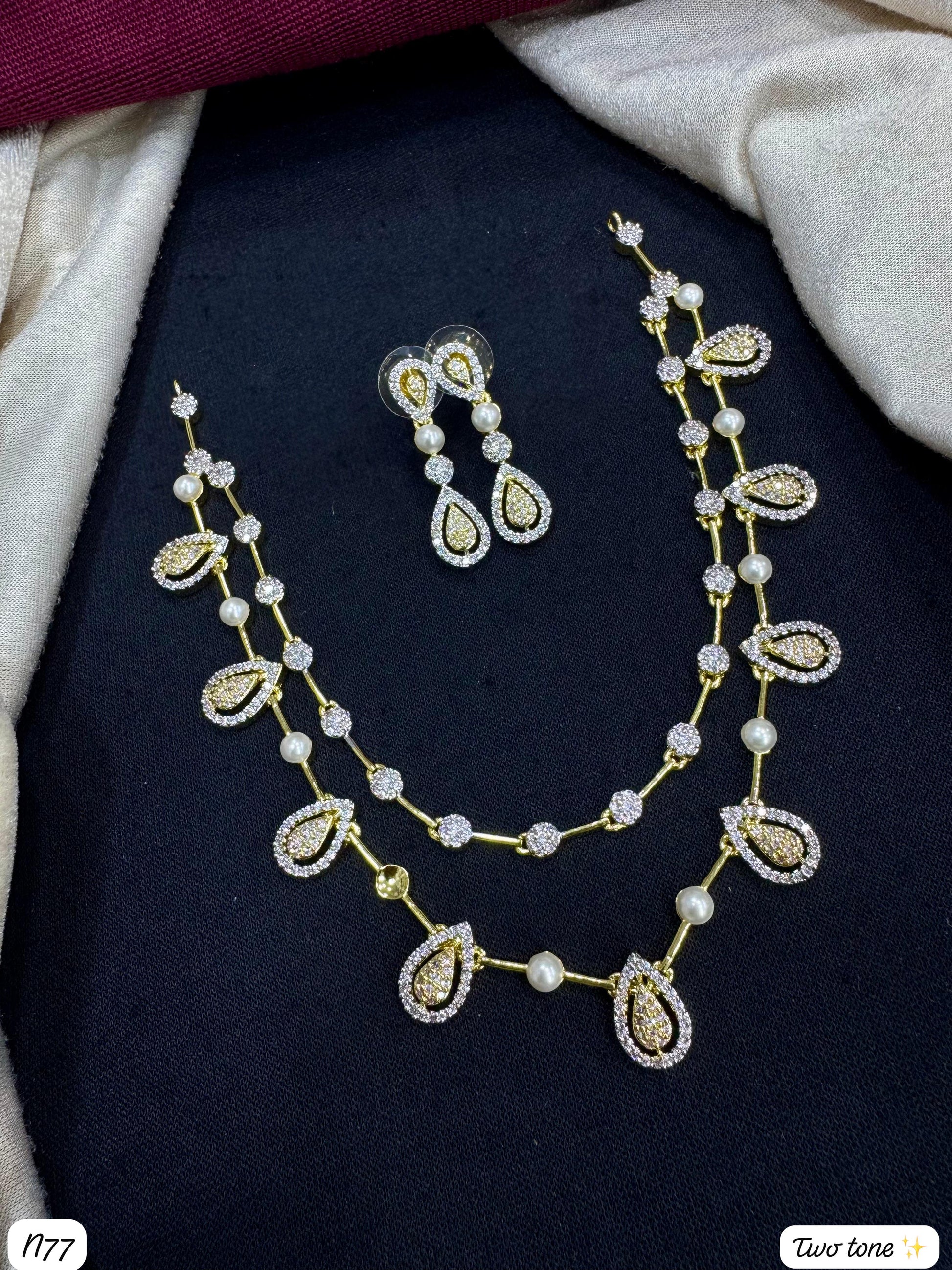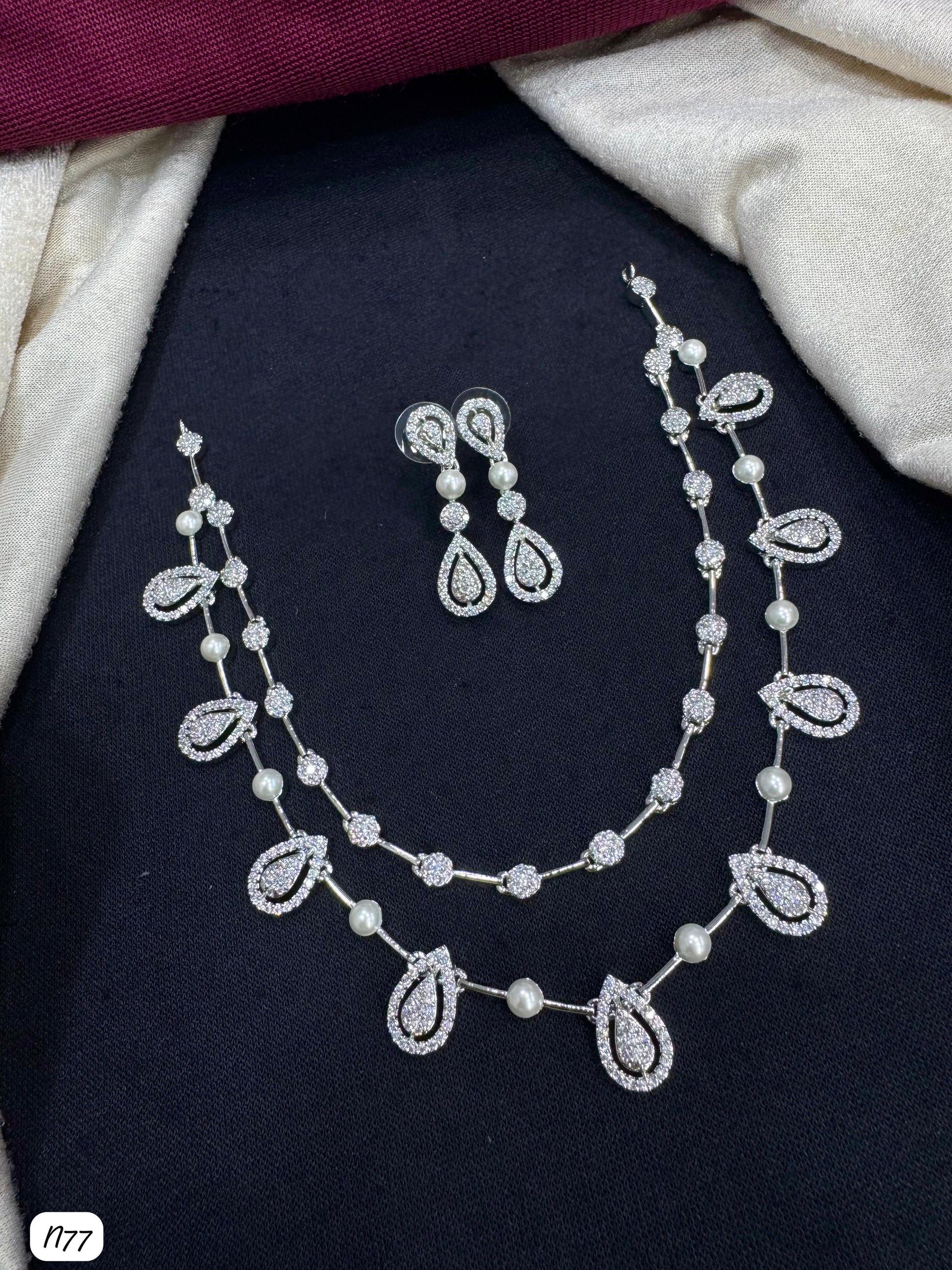 Elevate your elegance with the Elegant Teardrop AD Necklace & Earring Set from Lucentemarket. Designed with sparkling American Diamond (AD) stones and graceful teardrop motifs, this lightweight jewelry set is the perfect companion for festive occasions, weddings, or a classy evening look.The fine pearl detailing and precise craftsmanship offer a perfect balance of luxury and subtlety, making this set a timeless addition to your collection.